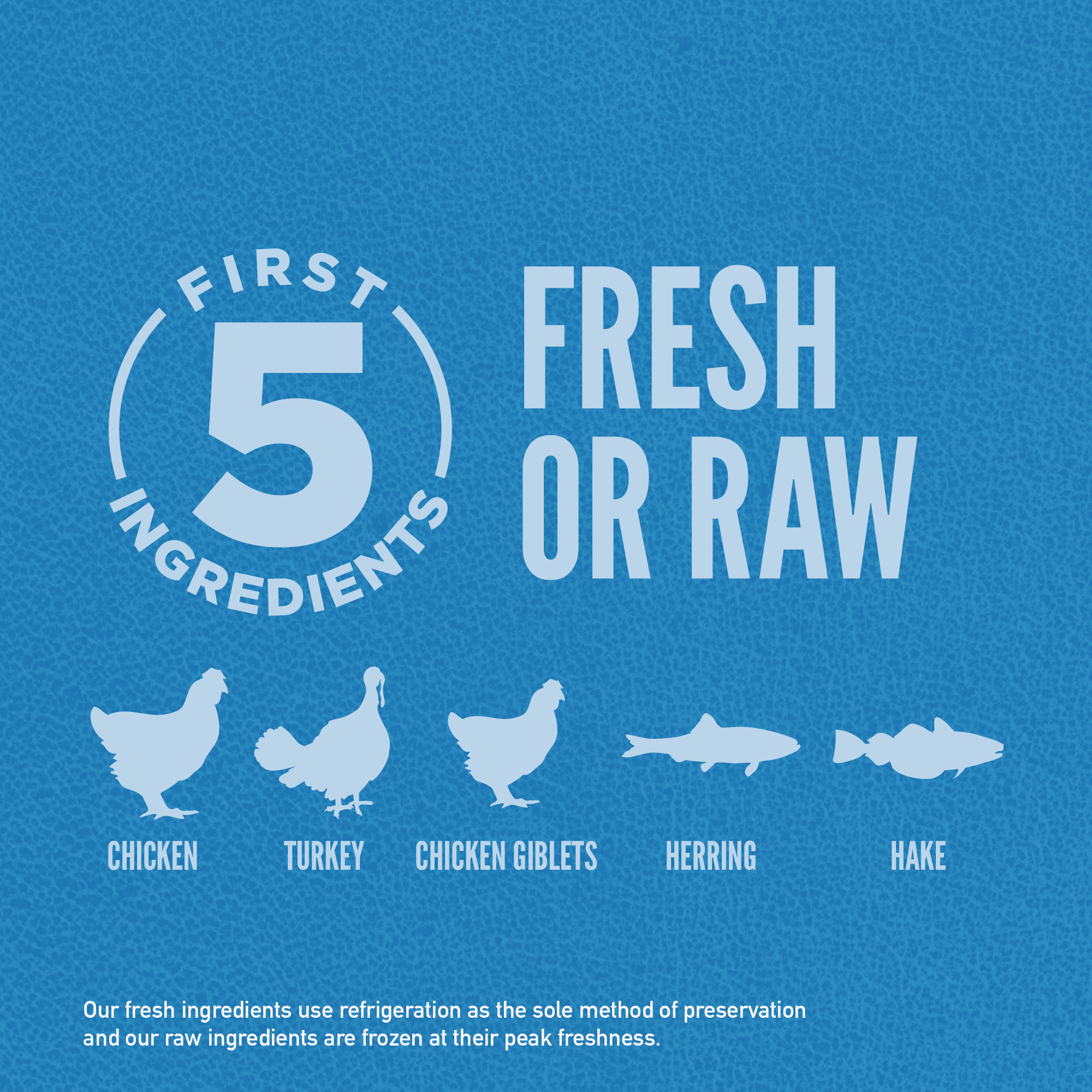 Fresh chicken (25%), raw turkey (8%), fresh chicken giblets (liver, heart) (7%), raw whole herring (6%), raw whole hake (5%), fresh eggs (5%), raw turkey liver (5%), dehydrated chicken (4%), dehydrated turkey (4%), dehydrated mackerel (4%), dehydrated sardine (4%), dehydrated herring (4%), whole red lentils, whole chickpeas, whole peas, chicken fat (3%), whole green lentils, whole pinto beans, whole navy beans, lentil fibre, pollock oil (1%), pea starch, dried kelp, fresh whole pumpkin, fresh whole butternut squash, fresh whole zucchini, fresh whole carrots, fresh whole apples, fresh whole pears, dried chicory root, fresh kale, fresh spinach, fresh beet greens, fresh turnip greens, whole cranberries, whole blueberries, whole saskatoon berries, turmeric, milk thistle, burdock root, lavender, marshmallow root, rosehips.