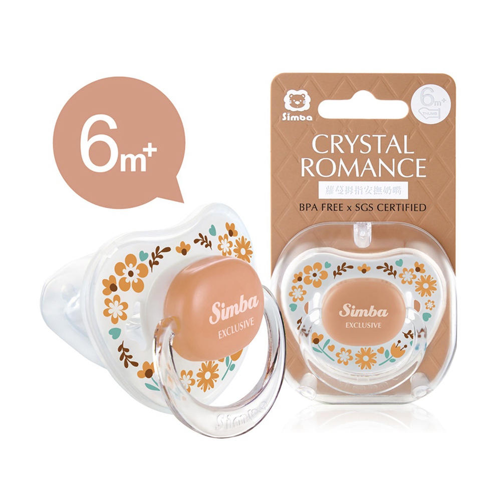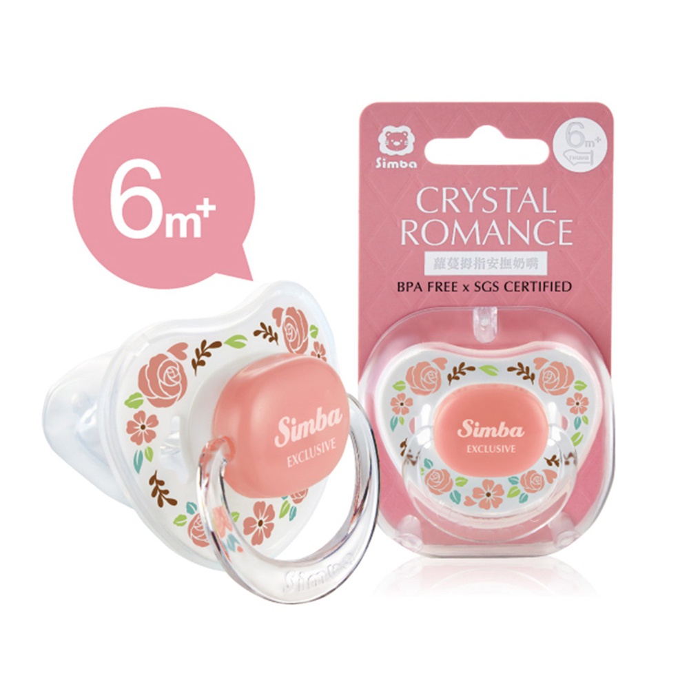 Simba Crystal Romance Pacifier Ergonomic thumb shaped pacifier that is designed for baby’s natural jaw and teeth shape. Groove design prevents saliva adhesion between lips and pacifier. Its smile curve design with round edges gives baby the ultimate comfort. Hygienic case included. BPA-free and SGS-certified material.