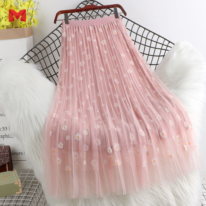 Hot Sale Women Long Skirts High Waist 3 Layers Mesh Gauze Skirt Girl Pleated Print Sweet A- Line Skirt