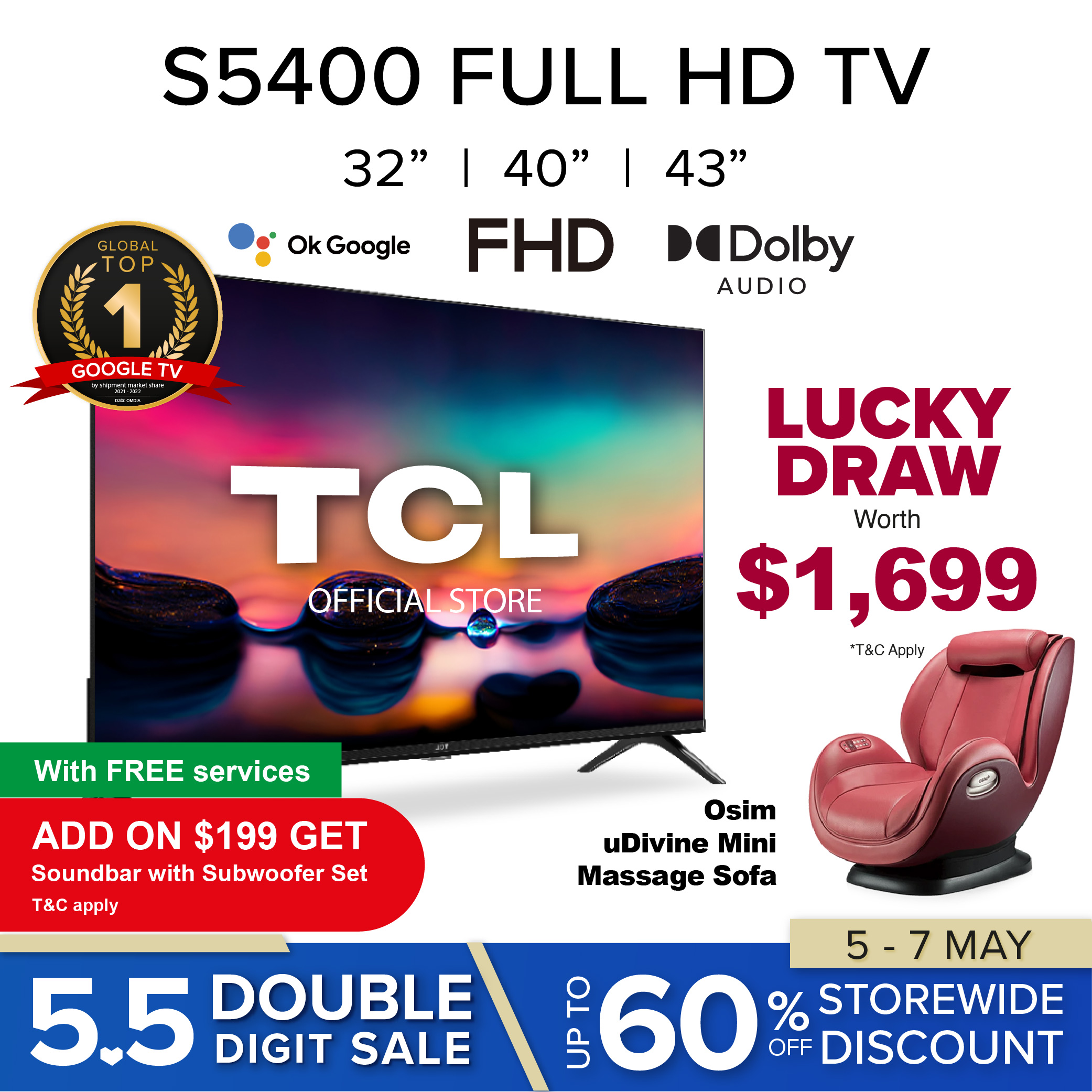 New | TCL S5400 Best Value Full HD Smart TV 32 40 43 Inch | Android TV | Google TV | Smart Flat Screen TV | Micro Dimming| Dolby Audio | HDR | Chromecast