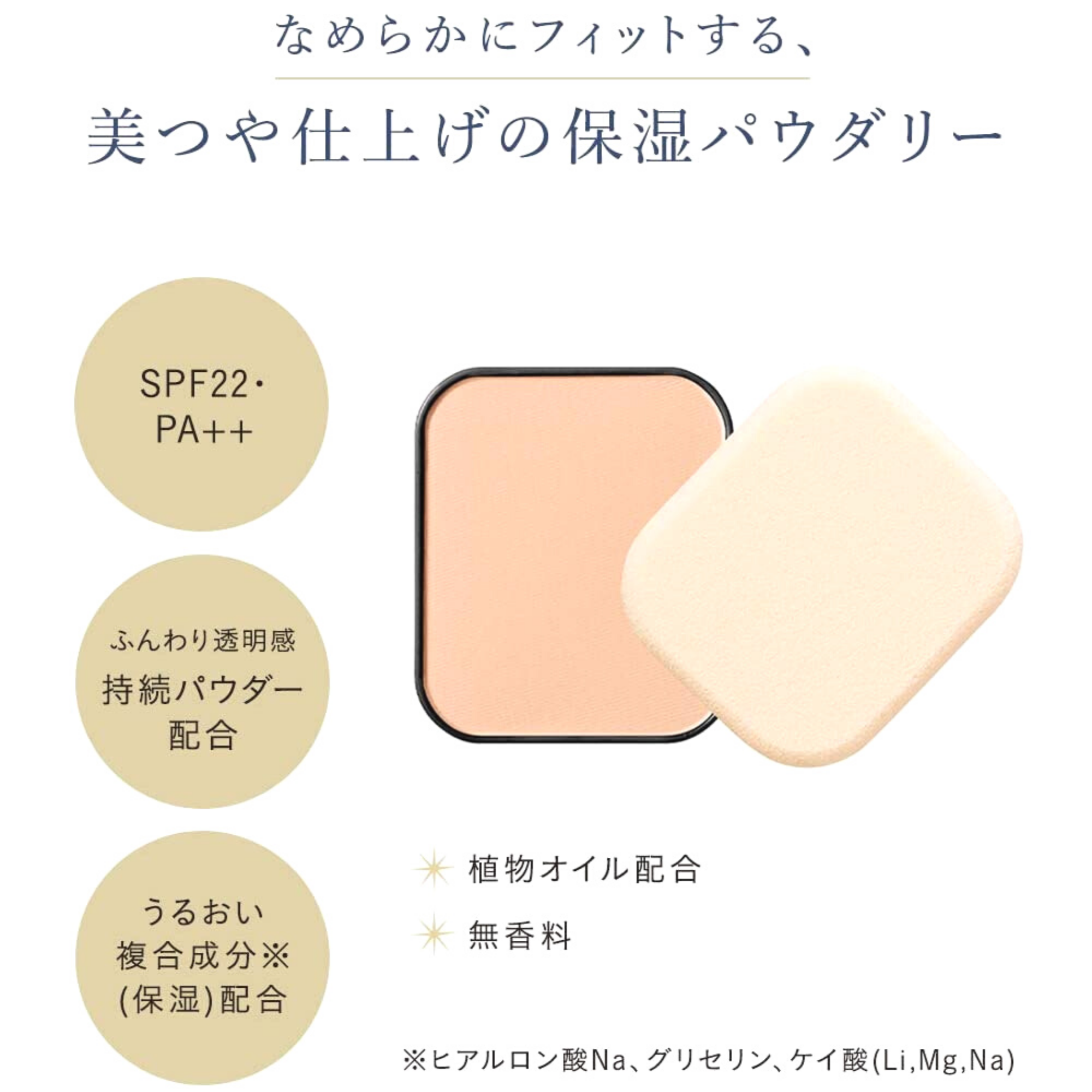 Talc, Titanium Oxide, Ethylhexyl Methoxylate, Zinc Oxide, Baked Sericite, Silica, Bismous Oxysilicate, Nylon-12, Diisosteeryl Malate, (Vinyl Dimethicone / Methicone Silsquoxoxane) Cross Polymer, Carboxydecilocyde Siltriciloxane, (Diphenyldimethicone / Vinyl Diphenicone Ruzimethicon /Silsesquioxane) Cross polymer, diphenylxyloxifenyl trimethicone, cannabara fruit oil, sodium hyaluronic acid, ascorbyl dipalmitate, dimethicone, sorbitane sesquisosteepic acid, methicone chloride, Zinc, Synthetic Wax, Triethoxyllethylpolydimethylxyethylhexyldimethicone, silicate (Li/Mg/Na), tetrahydrotetramethylcyclotetrasiloxane, glycerin, tocopherol, hydrogen dimethicone, BHT, tetradesen, alumina, chlorphenesine, mica, iron oxide a