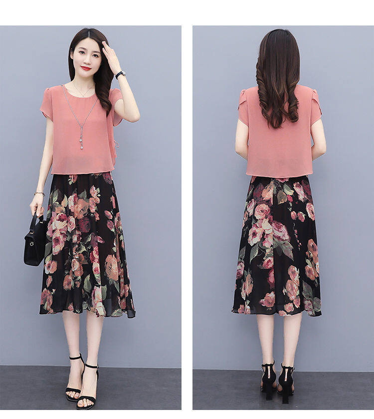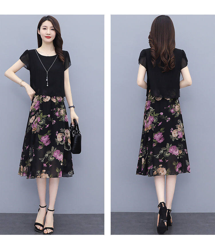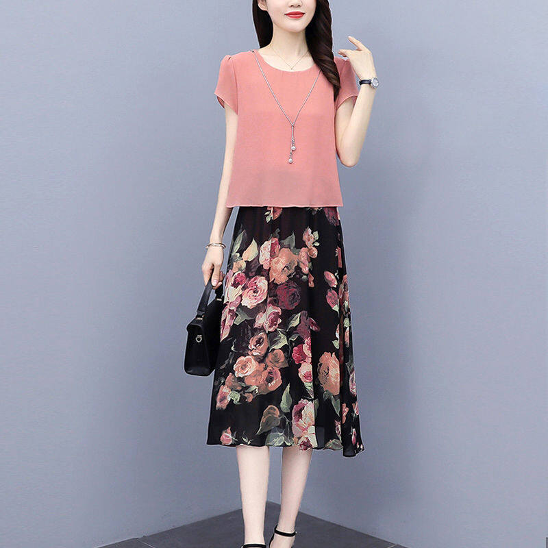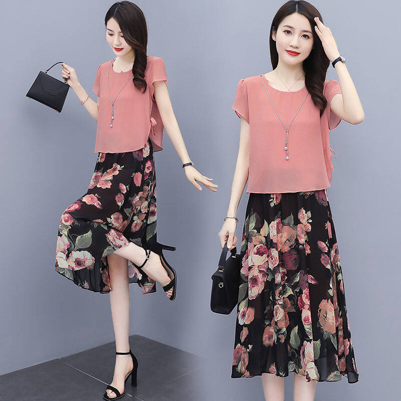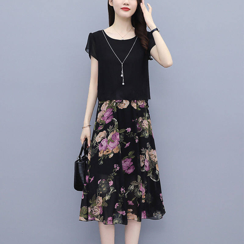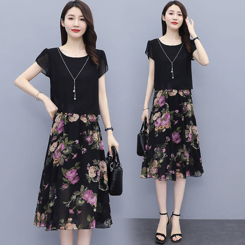 Large Size Belly-covering Fake Two-piece Dress Women's Summer New Style Slimming Mother Floral Chiffon Skirt