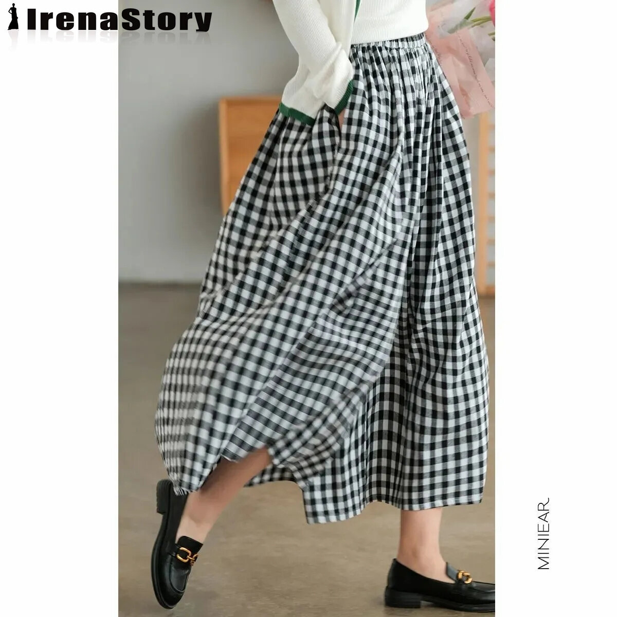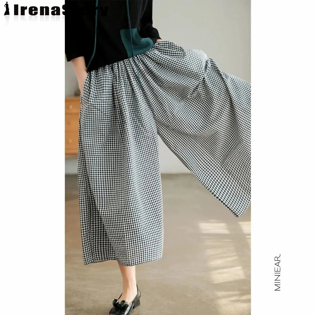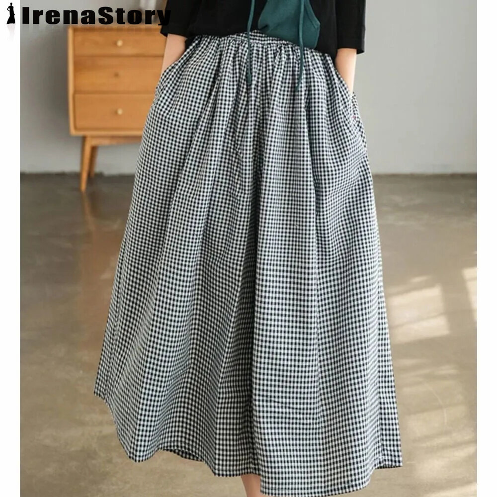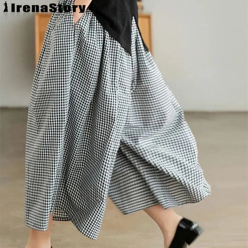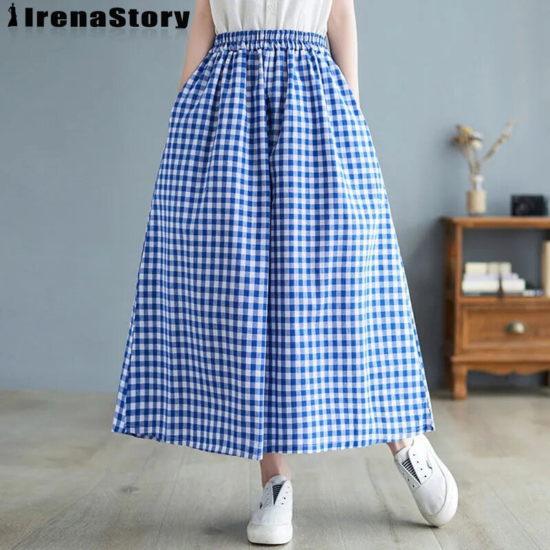 IRENASTORY Women's Culottes Fashion Casual Cotton Linen Plaid Wide Leg Pants Large Size Loose Comfortable Pants