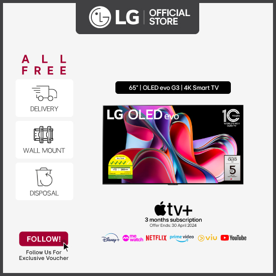 [Bulky] LG OLED65G3PSA 65'' OLED evo G3 4K Smart TV + Free Delivery + Free Wall Mount Installation worth up to $200 + Free Disposal