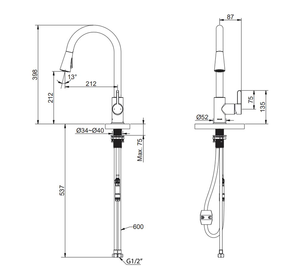 KOHLER Atom Pull-Out Kitchen Sink Faucet, Single-handle, Hot & Cold Mixer, Polished Chrome K-25981T-4-CP