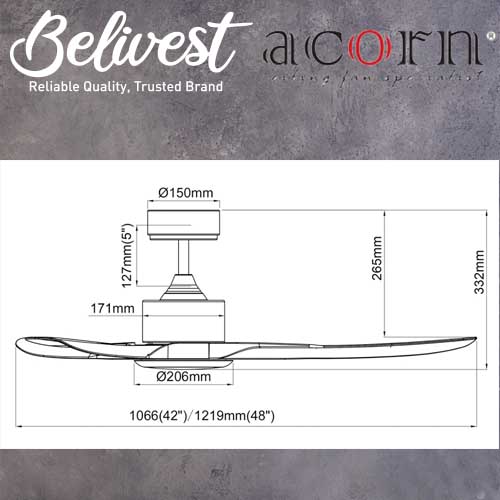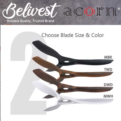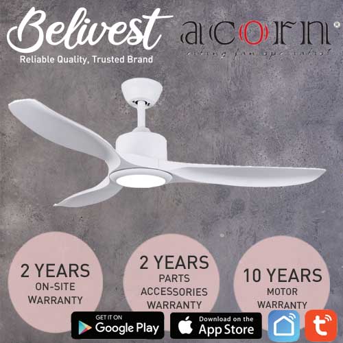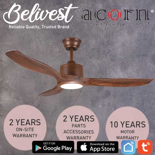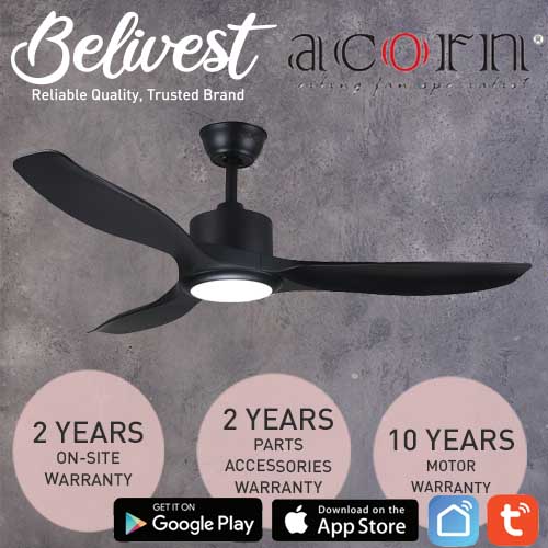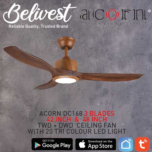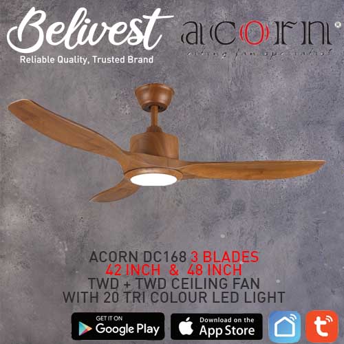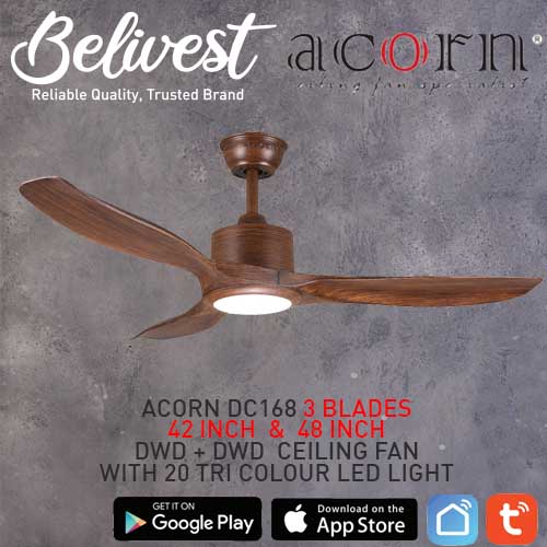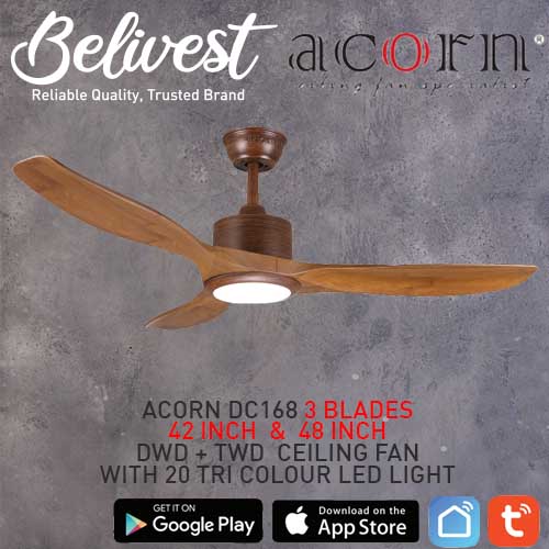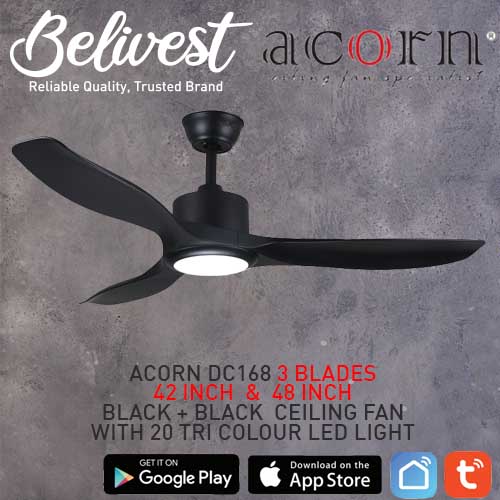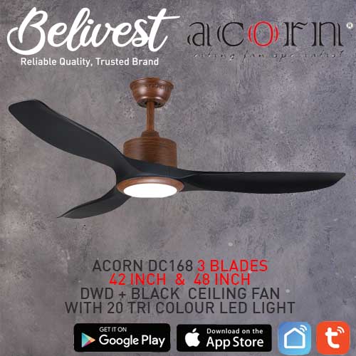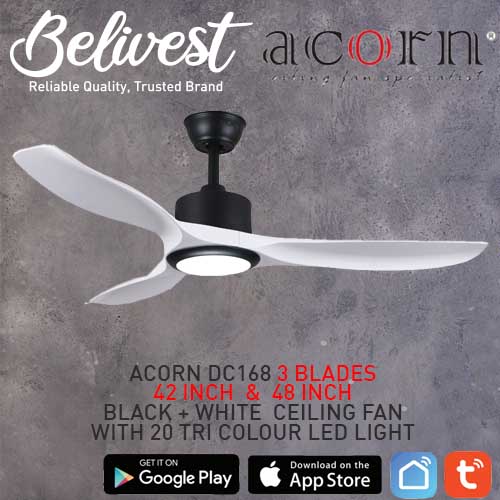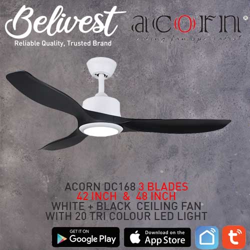 (PRICE GUARANTEED) Acorn DC-168 SMART Ceiling Fan - 3 Blades 42,48 Inch - White/Black/Wood - With/Without 20W LED - google home, amazon alexa, tuya smart life