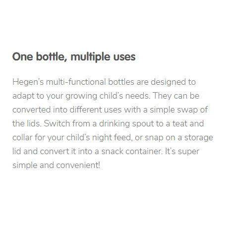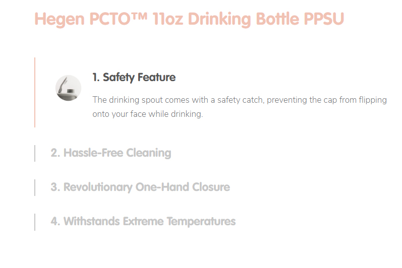 More than just a drinking bottle for the whole family, Hegen PCTO™ Drinking Bottle PPSU, 330ml/11oz is the world’s first drinking bottle with a unique one hand close. Useful for parents with their hands full, no screw threads, just Press-to-Close and Twist-to-Open!