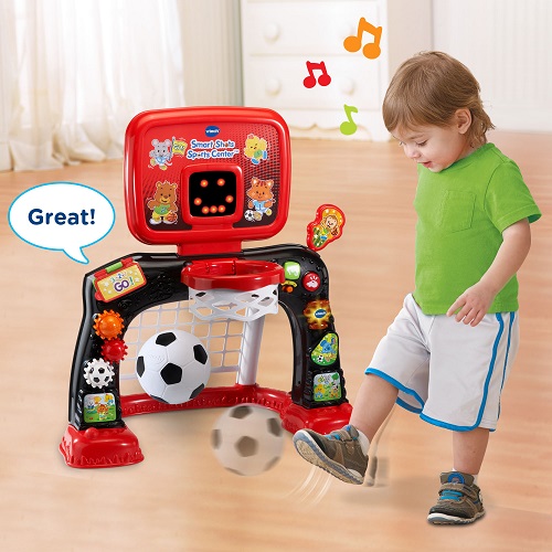 Cheer on your little sports star with the Smart Shots Sports Center™ by VTech®. This electronic sports center features a soccer net and basketball hoop for a fun 2-in-1 play experience. Toss the basketball into the hoop and watch as the LED screen counts the number of baskets. Kick the soccer ball into the net, and the sports center will respond with encouraging sounds and phrases. In addition to counting baskets, the LED screen also encourages play with fun animations. Build fine motor skills with a variety of manipulative features. Turn the gears to hear playful sounds and press the shape buttons to learn shapes, numbers and hear fun sounds. Score, learn and win with the Smart Shots Sports Center!