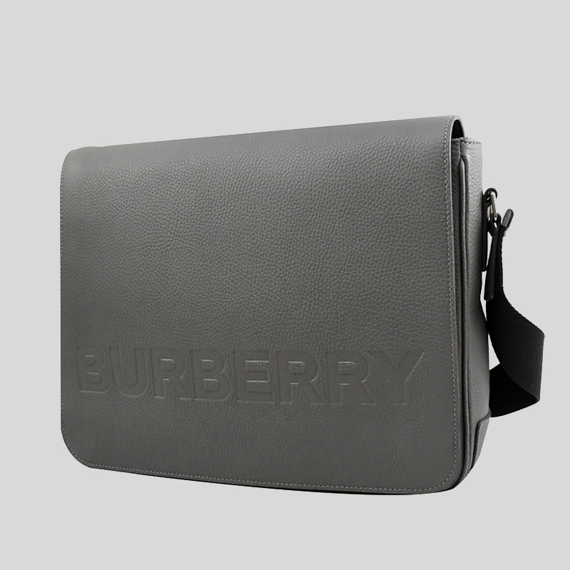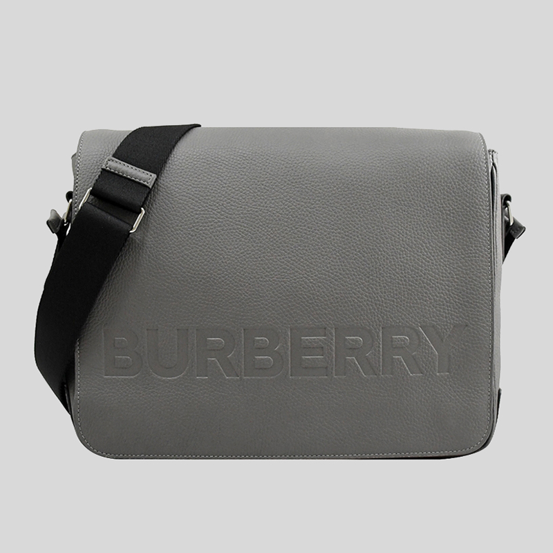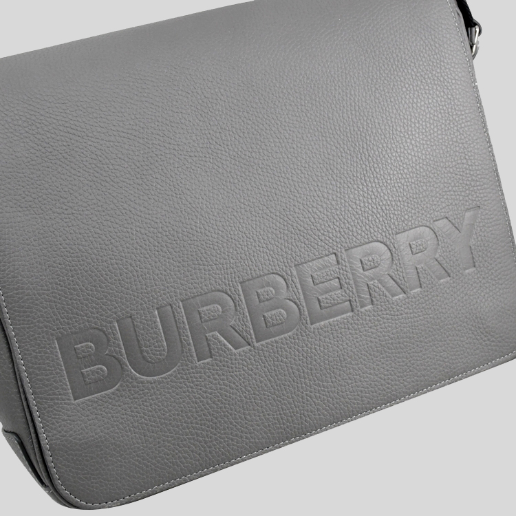 COLOUR: Grey MATERIAL: Cow leather SIZE: 32 x 26 x 7cm PRODUCT DETAILS: Adjustable crossbody strap Exterior 1 zip pocket, 1 main ompartment with 1 zip pocket Magnetic closure Silver-tone hardware Burberry lettering logo at front Imported Style # 80528721
