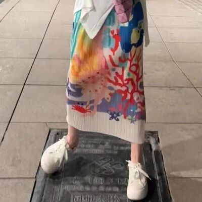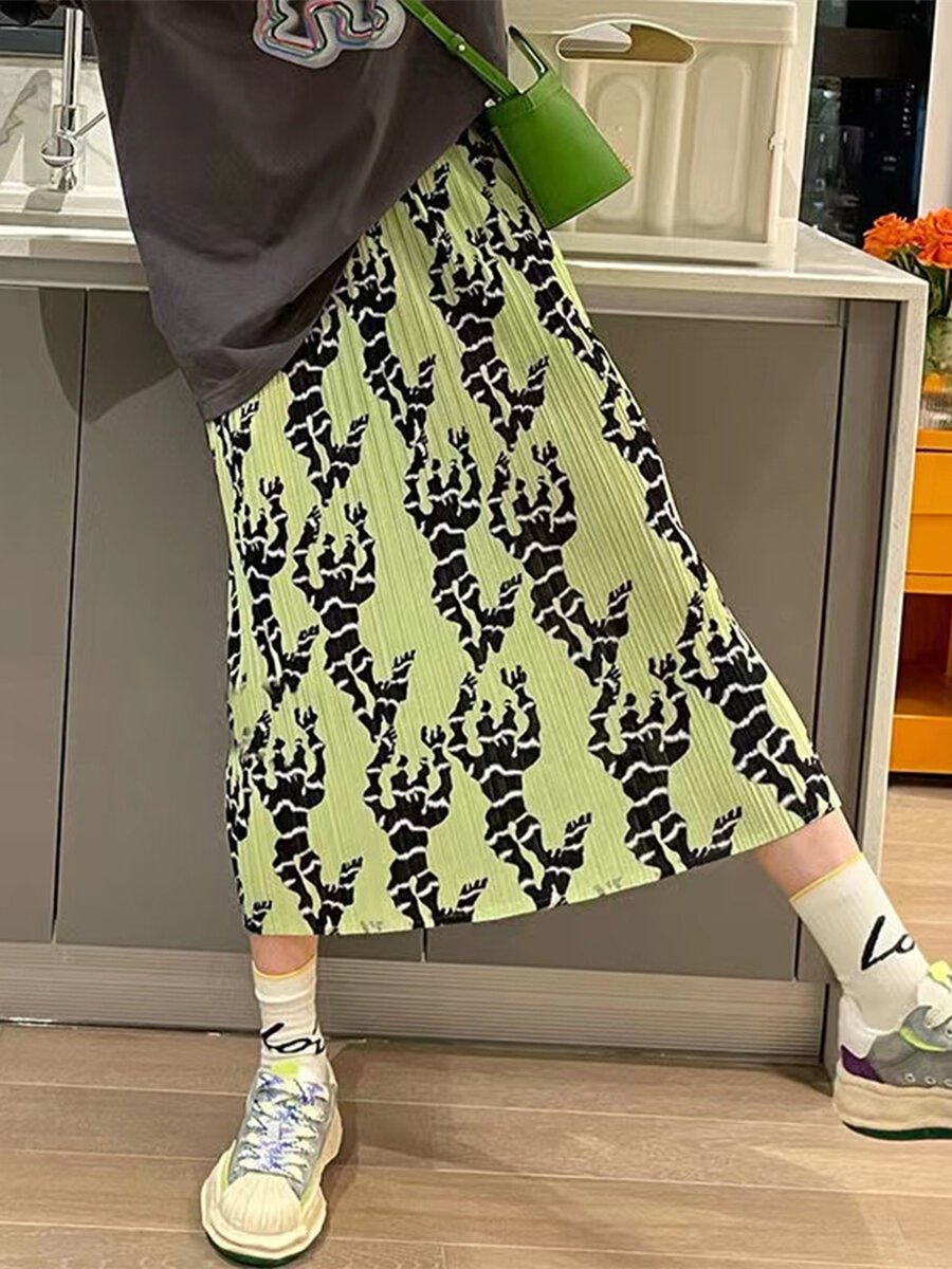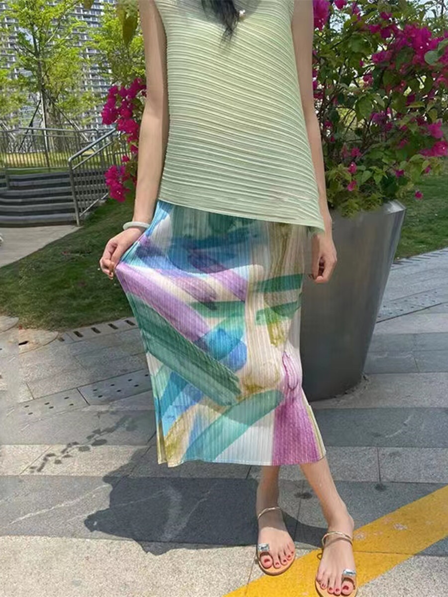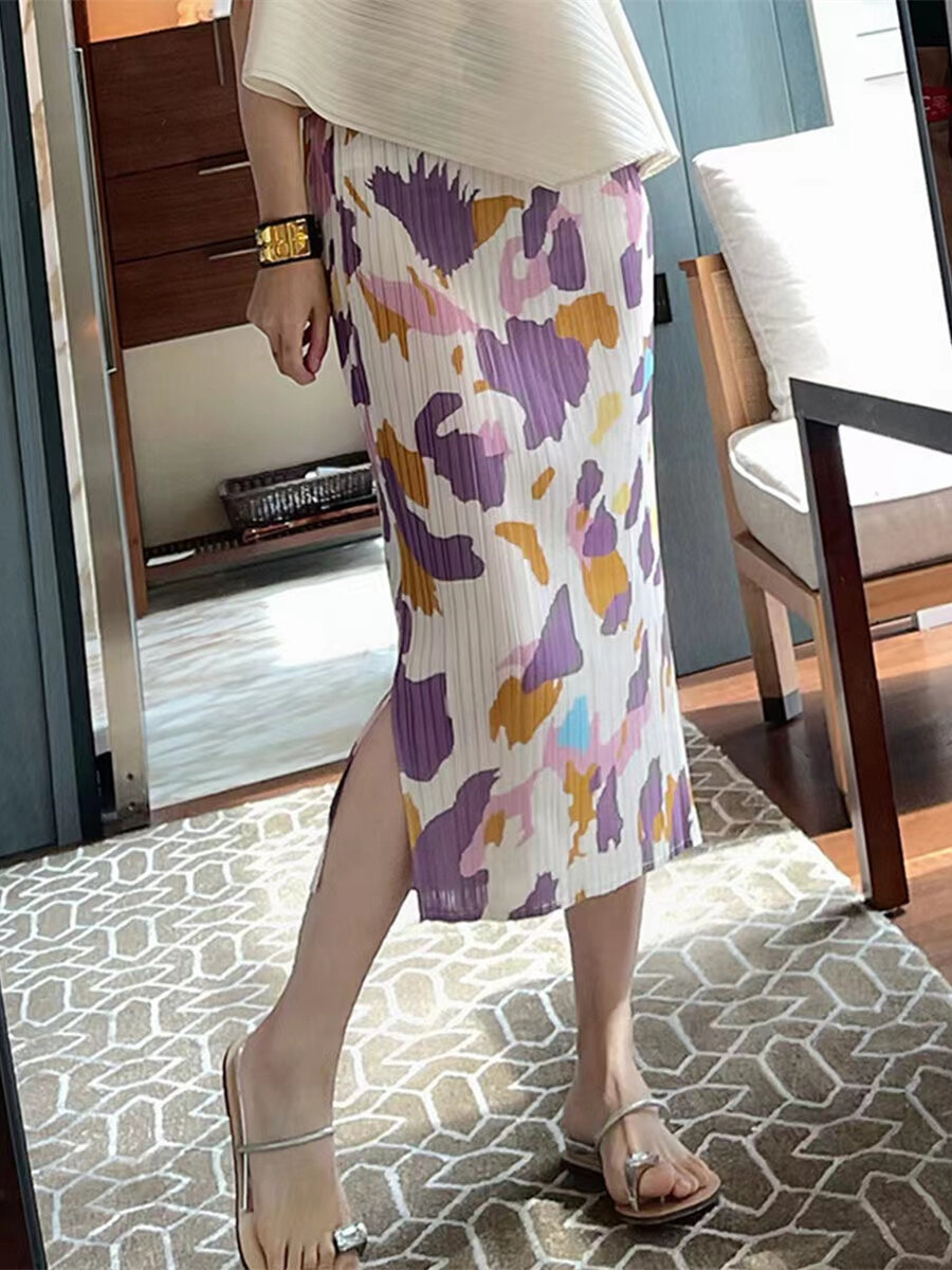 Pleated Skirt a-Line Slit Midi Skirt Women's Summer Thin High Waist Loose and Slimming Pleated Skirt Floral Skirt
