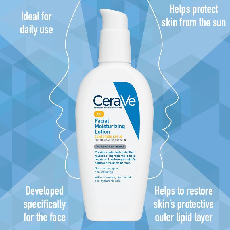 CeraVe AM Facial Moisturizing Lotion & PM Facial Moisturizing Lotion AM Facial Moisturizing Lotion: Elevate your morning routine with CeraVe AM Facial Moisturizing Lotion. This dermatologist-developed formula combines hydration and sun defense with broad-spectrum SPF 30 protection. Patented MVE Delivery Technology ensures a steady release of ceramides throughout the day, fortifying your skin's natural barrier for lasting moisture. Key Features: Hydration and Sun Defense: Seamlessly integrate hydration and broad-spectrum SPF 30 protection. Ceramide Technology: MVE Delivery Technology provides a continuous supply of nourishing ceramides. Broad-Spectrum SPF 30: Guard against UVA and UVB rays, preventing sunburn and premature aging. Gentle on the Skin: Non-comedogenic and fragrance-free, suitable for various skin types. Usage Instructions: Cleanse: Start with a thorough cleanse for optimal absorption. Apply: Gently apply to face and neck, ensuring even coverage. Reapply: Maintain sun protection by reapplying every two hours or more frequently if needed. Layering: Easily incorporate into your routine, applying before makeup for a smooth base. Precautions and Recommendations: Sunscreen Daily: Use daily, even on cloudy days, to protect against cumulative sun exposure. Avoid Eye Area: When applying, steer clear of the delicate eye area. Patch Test: Perform a patch test, especially for sensitive skin. Layering with Other Products: Compatible with other CeraVe skincare products. Layer over serums and under makeup. PM Facial Moisturizing Lotion: Complete your evening routine with CeraVe PM Facial Moisturizing Lotion. This dermatologist-developed formula focuses on hydration and skin renewal, featuring essential ceramides to strengthen the skin barrier while you sleep. Key Features: Nighttime Hydration: Provide overnight moisture for a rejuvenated complexion. Ceramide Technology: MVE Delivery Technology ensures sustained ceramide release throughout the night. Non-Greasy Formula: Lightweight and non-greasy, ensuring comfortable overnight wear. Gentle on the Skin: Non-comedogenic and fragrance-free, suitable for various skin types. Usage Instructions: Cleanse: Start with a gentle cleanse to prepare your skin. Apply: Gently apply to face and neck before bedtime. Precautions and Recommendations: Nightly Renewal: Incorporate into your nightly routine for optimal hydration and skin renewal. Avoid Eye Area: When applying, avoid contact with the delicate eye area. Patch Test: Perform a patch test before full application to ensure compatibility. Elevate your skincare with ceramides, whether facing the day or settling in for the night. Trust CeraVe for lasting hydration and skin defense.