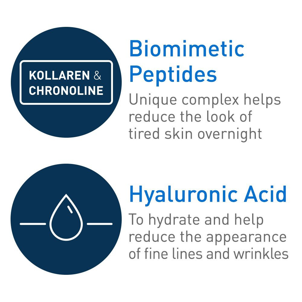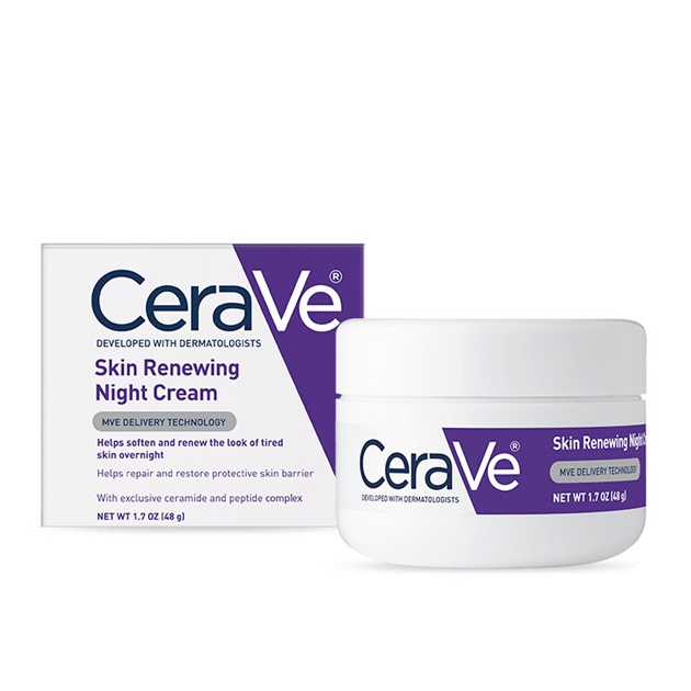 Product Description: Nighttime is the skin’s chance to help renew itself, and a properly formulated night cream provides hydrating and rejuvenating benefits. We recommend looking for formulas designed with hyaluronic acid, niacinamide and ceramides to hydrate, calm and restore the skin barrier, like our CeraVe Skin Renewing Night Cream, which also features peptides to help improve the appearance of fatigued skin. Suitable for all skin types, CeraVe Skin Renewing Night Cream features a complex of biomimetic peptides, hyaluronic acid, and 3 essential ceramides that work together to lock in skins moisture and help restore your skin’s protective barrier overnight. Our non-greasy, intensely moisturizing skin renewing night cream is designed to soften and renew the look of tired skin, and our patented MVE technology encapsulates ceramides to ensure efficient delivery within the skin’s barrier and slow release over time. Supporting your protective skin barrier, long after you’ve finish applying —so you can wake up looking rested and rejuvenated. ⭐Benefits: • Helps soften and renew the look of tired skin overnight • Provides intense hydration • MVE Technology: This patented delivery system continually releases moisturizing ingredients for all night hydration • Biomimetic peptides: Improve the appearance of tired-looking skin • Ceramides: Help restore and maintain the skin’s natural barrier • Hyaluronic acid: Helps retain the skin’s natural moisture • Niacinamide: Helps calm the skin • Non-comedogenic and fragrance-free • Developed with dermatologists.