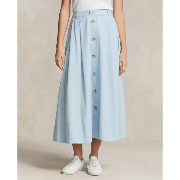 Made with lightweight Japanese chambray, this skirt has a fluid A-line silhouette and a buttoned placket.