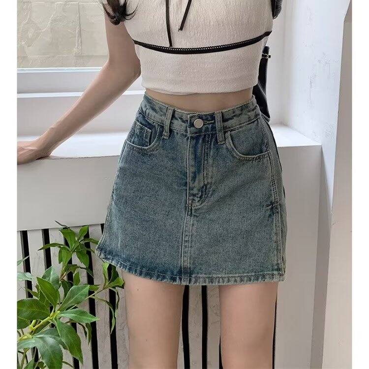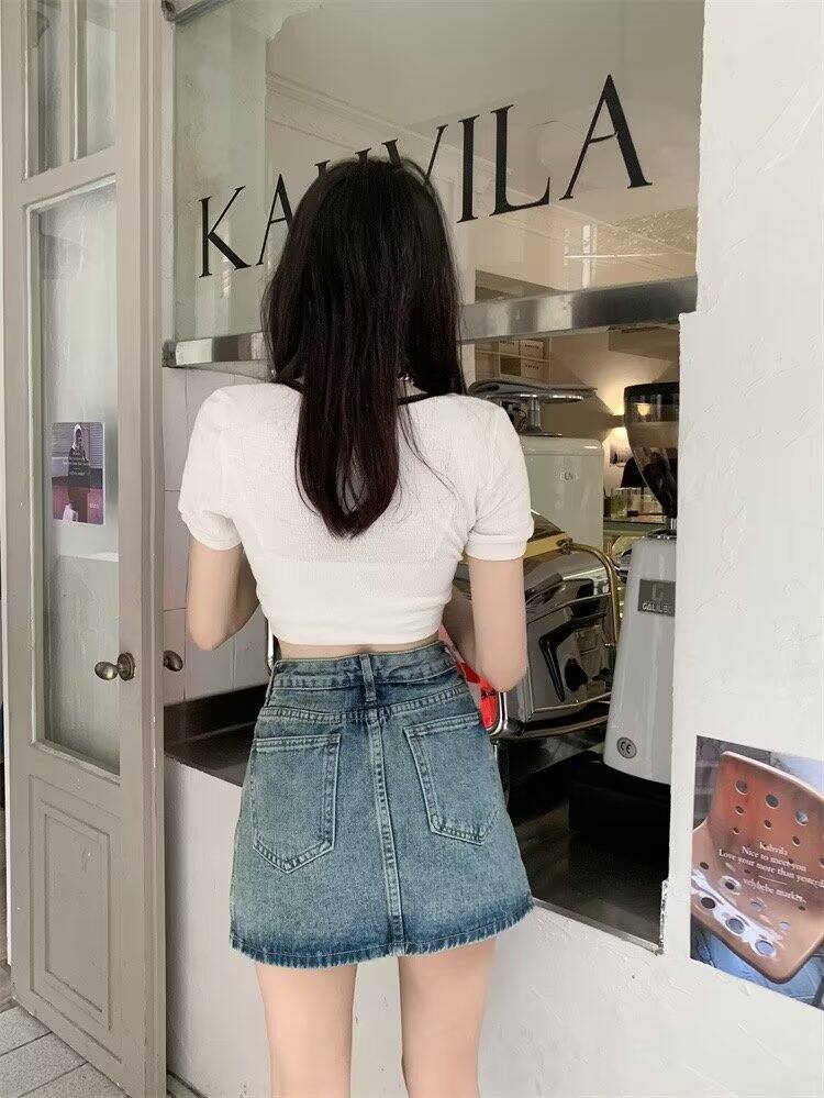 Sexy Split Denim Skirt 2024 Summer College Style High-Waisted Trousers Skirt Fashion Tape A- line Skirt Hip Skirt