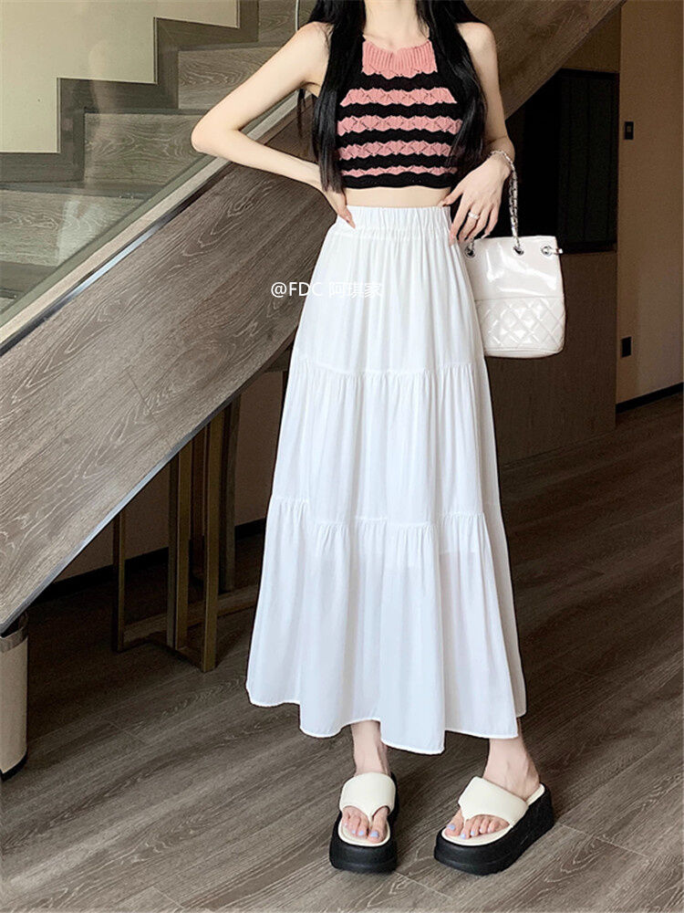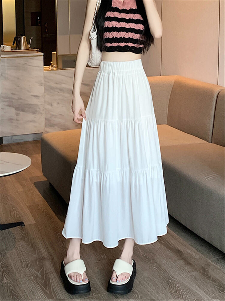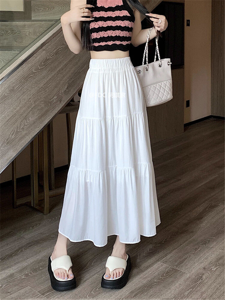 White Skirt Women's Spring and Autumn 2024 New Arrival Elastic High Waist Cover Slim Looking Mid-Length Tiered-Ruffle Dress Umbrella Skirt Ins
