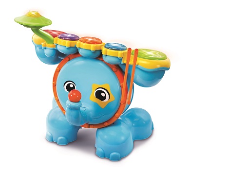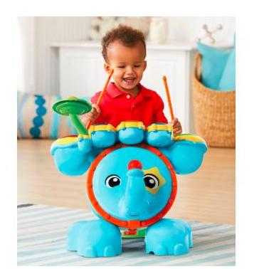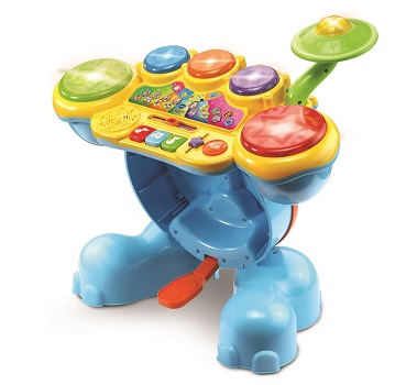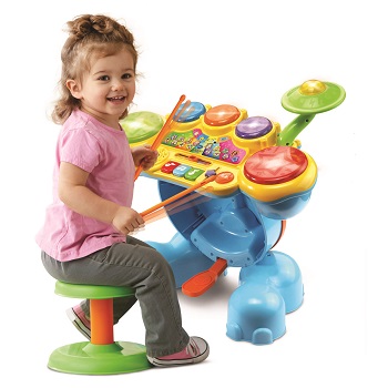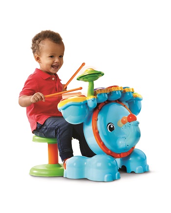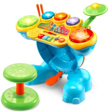 Get ready to rock with the Safari Sound Drums ™ by VTech®. Encourage your little one to be a star while they enhance creative thinking and motor skills by tapping out beats and creating their own sounds using the included drumsticks! They will enjoy this fresh way to practice counting and develop coordination while following along with the melodies and sing-along songs! Four game modes let your child tap the drums to learn counting, catch the lights, follow the leader or create their own composition. Your mini musician will love sitting on the stool and stepping on the elephant bass pedal to see the elephant trunk move up and down and create a fun bass sound effect. Watch them jam out to the beat of their own drum and create some sweet rockin' tunes!