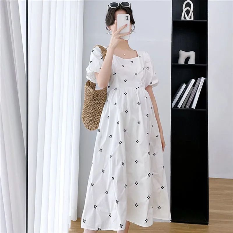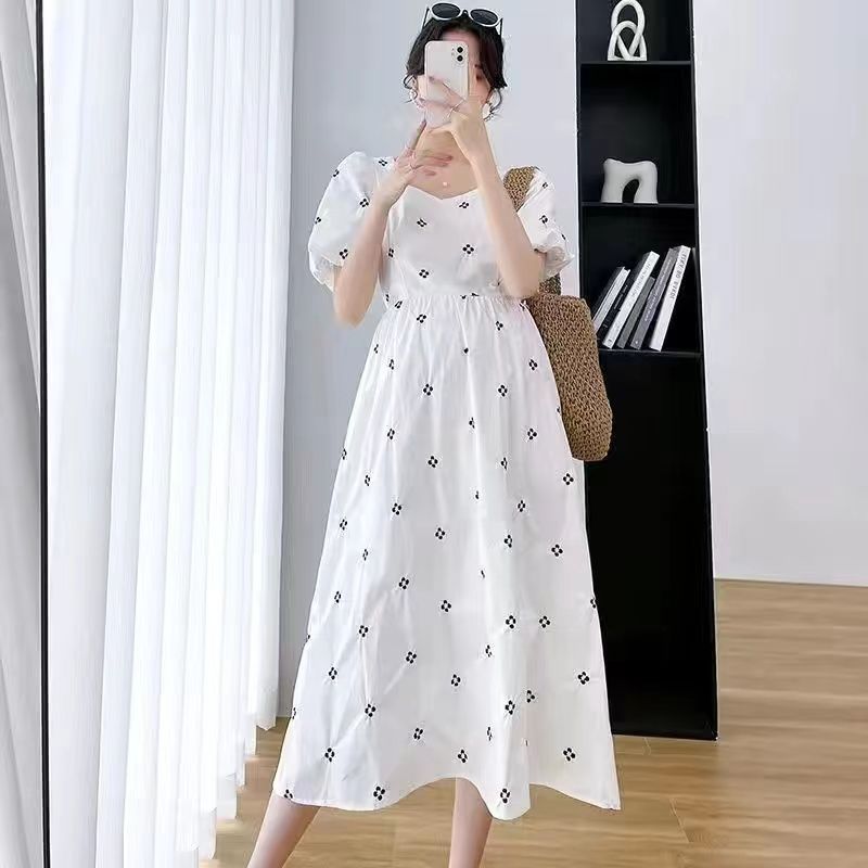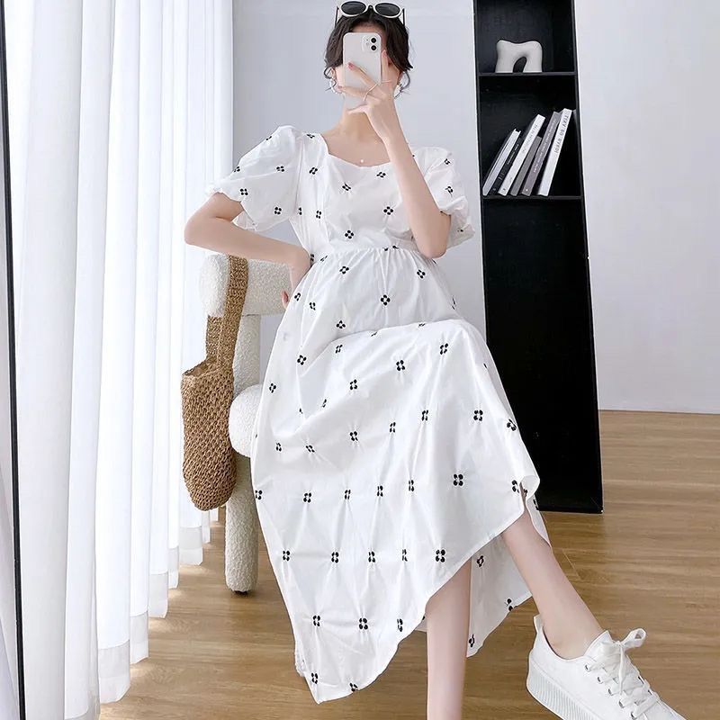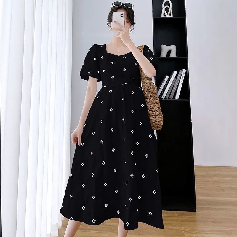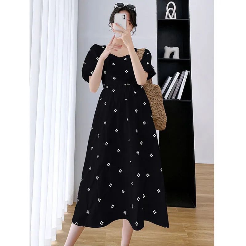Maternity Dress Korean Style Plus Size Summer High Waist Slimming Cover Belly Pregnant Women Dress Fashion Loose Flower Pregnant Dress Casual Mid-length Short-sleeved Maternity Dress Pregnant