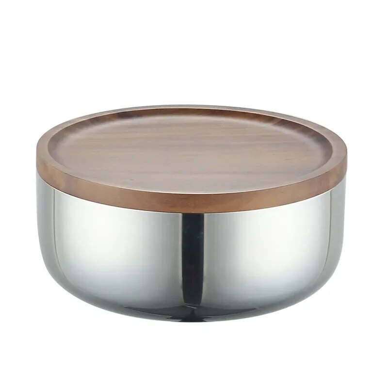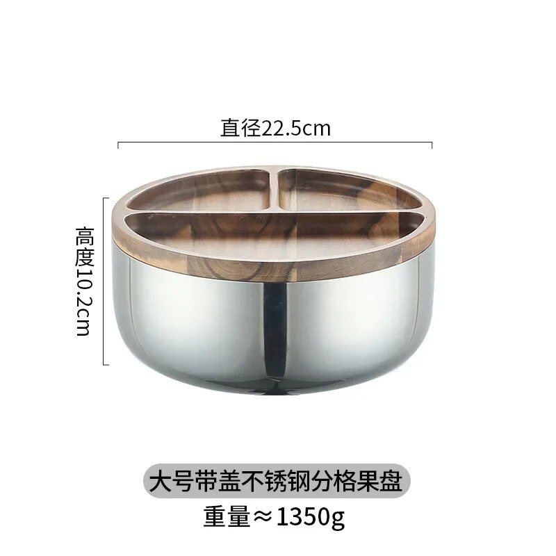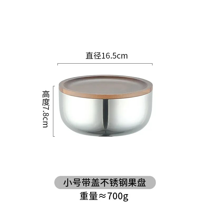 Wood Fruit Tray Three-Layer Stainless Steel Bowl Household Light Luxury High Foot Nut Snacks End Table Storage Decoration