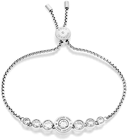 The Michael Kors jewelry collection is designed for timeless appeal. Crafted from hypoallergenic materials like stainless steel and brass with sparkling accents, rich in detail with enduring quality. This Michael Kors bracelet exudes jet-set glamour. Sparkling bezel-set crystals in graduated sizes accent the central logo-engraved charm set with a brilliant-cut crystal. The clasp is also finished with the Michael Kors logo and an additional crystal. This chain bracelet features silver-tone stainless steel and an adjustable slider closure. Inner Diameter 2.25"; Width 0.375" Closure Type: Slider Finish: Polished #94,063 in Clothing, Shoes & Jewelry ( ) #26 in