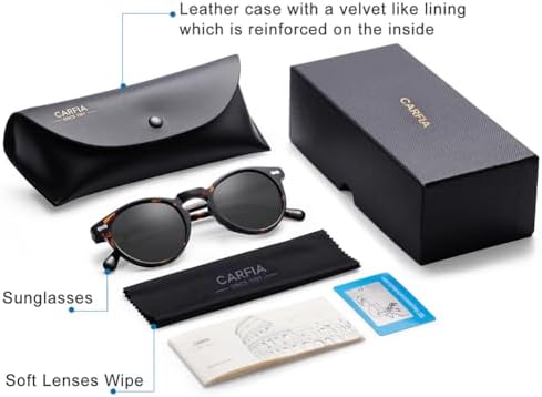Sunglasses for men polarized uv protection: Carfia UV400 Protection Lenses for keeping your eyes healthy without strain, blocking out 100% of all UVA, UVB, UVC and harmful blue light up to 400nm. Perfect for outdoor activities, the lake, golf, driving and anything else the sun throws at you! These polarized mens sunglasses optimize the clearest, sharpest, most accurate vision, filtering out 99% of reflected glare without the haze and optical distortion that can come with traditional polarized lenses. Premium polarization to restore true color and let you see what you have been missing, making the scenery more clear and soft. Hypoallergenic Hand-Crafted Acetate Frame for lightweight durability and all-day comfort, Lustrous, Skin-friendly, without pressure for nasal bridge or head. They are not cheap plastic frame nor coating patterns, Carfia hand-polished cellulose acetate frame are born with patterns embedded, with rich colours finish, which makes them as excellent as the world's most famous brand. 365 days warranty on frame & lenses (full refund immediately or a free replacement). Click the Product Page Logo of "MAYBE TRADE CO.,LTD" and contact Carfia service team. Package included: 【1* Men Sunglasses】 【1* Soft Lenses Wipe】 【1* Polarization Testing Card】 【1* Leather Case reinforced on the inside】 【1* Another Hard Protection Box】 Giving a modern interpretation of vintage design, with sleek contours for an active lifestyle, Carfia Classy Sunglasses are well compatible with everyday clothes and can be perfect decoration. Size Details: Lens width: 50mm, Lens height: 44mm, Bridge: 22mm, Arm: 145mm, Frame width: 142mm #9,500 in Clothing, Shoes & Jewelry ( ) #40 in