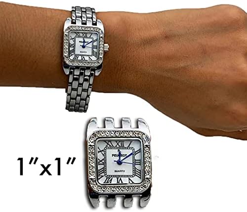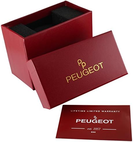 The panther design 4 link bracelet is soft and fluid that hugs the wrist for a most comfortable fit Bracelet is 7 inches in length. Links can be removed to make it shorter & extra links available at no cost. Fold over deployment clasp can easily slip on & off with no buckle to fuss with. This women watch features a white ceramic finish dial, black Roman numeral dial same as found in classic vintage watches. It is easy to read the time at a glance. The metallic blue hands ads the final touches for this unique timepiece. Make a statement! This Peugeot express the ultimate in luxury Swiss design. 14Kt gold plated tank case for long lasting luster and is 24mm (approx. 1") and ideal size for most average Women's wrist. Bezel is encrusted with hand set sparkling European crystals. All Peugeot watches are fitted with Accurate Quartz Movement manufactured by Seiko and backed by Lifetime warranty which includes FREE battery replacement. Watch comes with a presentation box ideal for gift giving. Water resistant: protected against accidental water contact such as splashes, moisture and rain. Not recommended for submerging in water. #333,230 in Clothing, Shoes & Jewelry ( ) #1,077 in