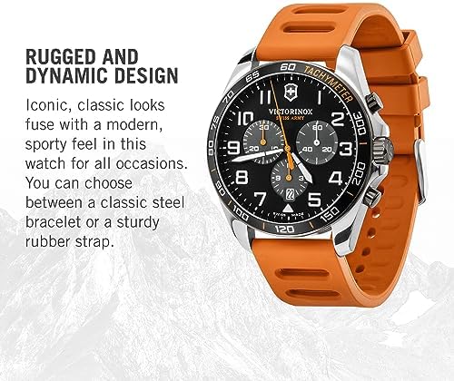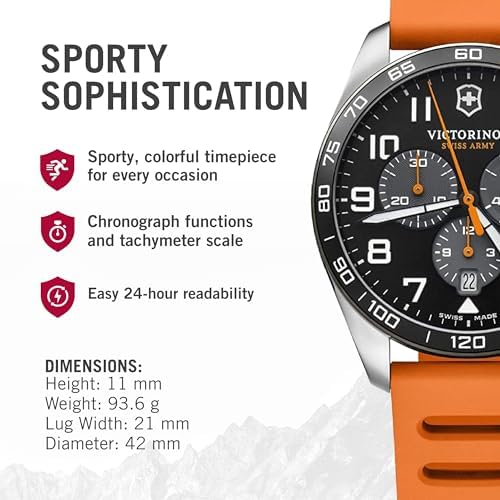 Sleek Men's Watch: This watch has a sporty, colorful look; it also has chronograph functions and a tachymeter scale, plus generously sized hands and numerals featuring Super-LumiNova for easy readability Luxurious Gift: One of our elegant Swiss watches makes a great gift for an anniversary, holiday, or birthday Stainless Steel Wristwatch: This Victorinox watch is made with quality stainless steel, making it tough and durable Premium Swiss Watches: Each of our watches is crafted and designed to strike the perfect balance between performance and timeless elegance About Victorinox: Our Swiss-based company focuses on making high-quality knives, watches, and more; we are committed to excellence, innovation, and sustainability #1,328,690 in Clothing, Shoes & Jewelry ( ) #7,769 in