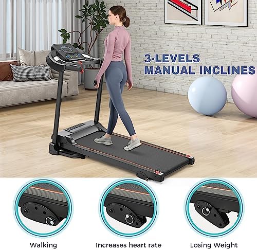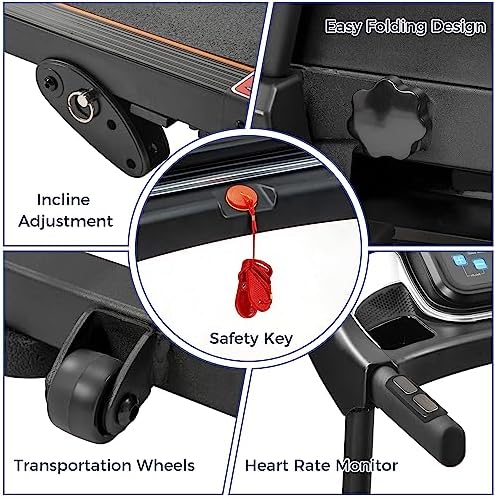 【Multiple Optional Function】As a Merax treadmill user, you can easily get access to the diverse 12 pre-set HIIT running mode from P1 to P12 range between 0.5 to 7.5 MPH with the quick touch of the button. So that you can control the intensity and rhythm of the training as you want to better fit your own exercise goals. 【Best Fit Size】This treadmill with incline provides a large LED display screen to track progress in speed, distance, heart RATE, and calories burned while the 15.5” wide running tread belt gives you the best workout experience. With Integrated Tablet Holder and Dual Cupholders featured on both sides of the LED display keep all auxiliary equipment on standby. 【Foldable & Safety】Merax electric folding treadmill comes fully with all required tools and instructions and assembled, simply unfold it and tighten the screws to start running immediately. And free up floor space by simply folding your treadmill up. Prevent Slipping Belt Design and Emergency Stop Key to ensure your safety. 【Dynamic Workout】The treadmills for home have MP3 and Audio Auxiliary Port, help you stay motivated during your workout by listening to your favorite playlist while running through the built-in dual speakers. Grip pulse Sensors monitor and maintain your target heart rate for optimal fitness results. 【Powerful & Quiet】Premium vacuum 2.5HP motor reduces noise while running indoor and fitted base rolling wheels on the treadmill underside provide easy and simple transport that protect your floors. Merax treadmill diemensions: 52" x 20.6" x 46.5". Folded dimensions: 26.5" x 24.5" x 50". 【Non-Slip Running Belt & Multifunctional LED Display】The 5-layer non-slip texture running belt features a spacious running area(43" x15.5"), providing an effective and safe cushion for your knees and muscles for a superior running experience. The folding treadmill's LED display clearly shows time, speed, distance and calories, monitoring your progress in real time and keeping your movement data at a glance. 【100% Satisfaction & Awesome Service】Merax is committed to providing every customer best possible experience and guaranteeing your satisfaction. Our team is Always Online and ready to help you with any questions you may have.