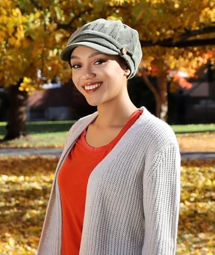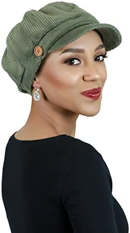 BRIANNA CABBIE NEWSBOY CAP FOR WOMEN OLIVE GREEN CORDUROY is a cute, retro chic, fall and winter hat that's perfect for cancer patients and women with medical hair loss. A great choice in chemo headwear LOVE BRIANNA'S CORDUROY CABBIE CAP IN OUTLANDER? Get the look with this cute wide wale corduroy cabbie hat. 6 pie-shaped sections on top and a button accent or either side FULLY LINED FOR COMFORT WITH FULL COVERAGE over the ears and neckline makes this classic fall cabbie or Gatsby hat a perfect chemo hat for women. Will not slip on a bald head COVERED ELASTIC AT THE NECKLINE FOR A SECURE FIT as a chemo cap for women with medium size heads, 22 inches to 23 inches as measured around the hair line THE SHORT 2 INCH BILL is nicely curved to frame your face without being overpowering. A cute fall fashion women's hat. Fully lined. 100% cotton #407,055 in Clothing, Shoes & Jewelry ( ) #121 in