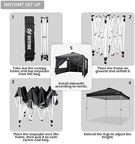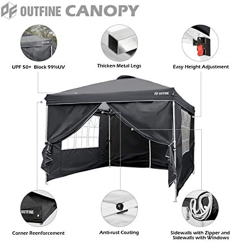 STURDY MATEL FRAME AND TARPAULIN - Canopy metal legs are of 28x28mm, and the top bracket is made of 13x28mm metal. Special thicken metal frame with anti-rust coating. The canopy tarpaulin is made of high density Oxford polyester fiber, with a special silver-plated PU lining, 100% waterproof, UPF 50+, it can block 99% of harmful rays of sunlight. FULL SET OF SUPPORT PARTS - 10 x 10 Ft pop up Canopy Frame, 10 x 10 Ft canopy top tarpaulin, 4 removable oxford cloth side walls, bonus 1 wheeled roller bag, 4 weight bags and 8 tent stakes and 4 ropes. The upgraded style wheeled roller bag is more rugged and durable. EASY TO ASSEMBLE - Only two people are required to easily complete the entire assembly in a few minutes. Take out the canopy frame and top tarpaulin from the bag, place it on ground and unfold it, place the tarpaulin over the frame, then pull it to each corner end fully and extend the legs and it is done. Three different height settings allow you to pick the height which you want, 73inch, 77inch and 81inch. Thumb latch lock system easy to lock and release. SMOOTH PORTABILITY - We bonus a convenient roller bag with heavy duty wheels, which is made of 600D coated PVC fabric, big enough as a storage bag for you to store the canopy when you are not using it. When you go out, you can put it in a vehicle and take it to any place you want. It is very easy to transport. MULTIPLE USE OCCASIONS - The shadow coverage of this canopy is 10 x 10 feet and it can accommodate 4 tables or 7-8 people at the same time. This canopy is suitable for home garden, play ground, yards, farm beaches, commercial area, large gymnasiums, construction area, disaster relief area and more. 4 side tarpaulins are included, 2 with zippers, and 2 with windows, it can be installed or disassembled according to different occasions, which is convenient and practical.