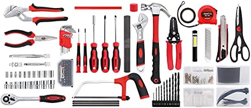 [Toolbox Included] - Includes 1-Drawer storage box with independent sliding drawer to enlarge the capacity more than common toolbox. Assortment of necessary tools are in one tool chest, durable plastic case with internal molded compartments to keep each component protected and easily accessible. All tools meet or exceed ANSI standard. [High Quality Material] - Made of high-quality steel and finished in heat treated chrome, durable and corrosion resistance. Handles made of TPR material, comfortable for grip. [Muti-purpose Tools Kit] - 325Pcs tools set for most small repairs and DIY projects around the house. It is perfect for handyman, construction workers, mechanics, work shops etc. This tool set is also a good gift choice for family member, friends, partners, etc. [Complete Varieties] - Comprehensive assortment of professional-grade wrenches, a complete range of 1/4 inch and 3/8 inch metric-sized sockets and precision screwdrivers, hammer, tape measure, pliers etc. The 72-tooth ratchet. Variety of 1/4-inch screwdriver bits: Phillips, slotted, square, star and pozi. Soft-grip handle on screwdrivers, pliers, srtipper and hammer provides excellent comfort and control. [Great Gift Choice] -This tool kit is easy to carry and stock. It is a good gift choice for men and women. Also this tool set is perfect for Father's Day, and is a great option as gift for Dad, Boyfriend & Brothers when chrismas.