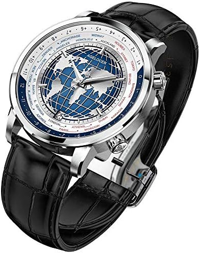 AGELOCER Men's Blue World Time Automatic Mechanical Calendar Fashion Luxury Stainless Steel Dress Watch Leather Band
