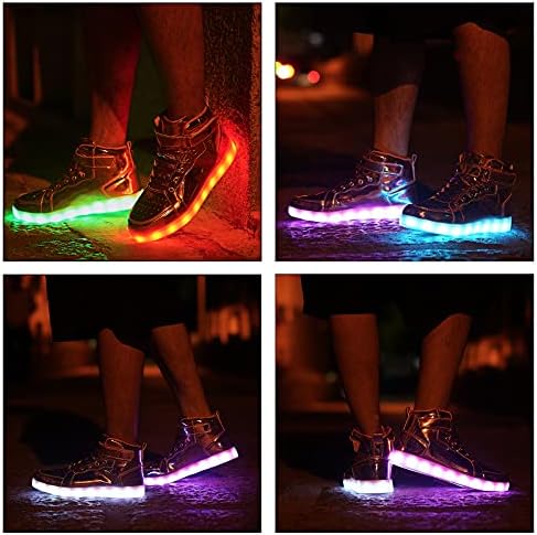 When you put on this high top LED Sneakers ,your feet can have 7 single colors glow and 4 flashing models,light up your feet and be the brightest star in the dark. High top LED shoes adopts durable PU Leather Upper material,cotton lining fabric,and non-slip rubber outsole can keep your feet comfortable for long walks. Special Design : Switch Button hiddening the strap in the lacing part,it's also a charging switch.Easy to control the light on and off, press it to switch on. With each press, it changes to another light mode.,at the same time the hidden button will not affect your comfortable wearing experience. USB Rechargeable: Each pair of shoes contains a cable. It is easy to recharge the shoes with USB cable, you can charge any place where you can connect the USB interface. This fashion LED shoes can be a caual sneaker,also can be a hip-hop shoes in the night. The unisex light up sneakers is a ideal gift, which are perfect for your families, friends and colleagues and you can wear it to the Night Club, Birthday/ Valentine's Day/ Halloween/ Thanksgiving Day/ Christmas present, Evening Riding and so on.Just choose a pair of shining shoes for your friends, lovers and kids soon. #67,087 in Clothing, Shoes & Jewelry ( ) #301 in