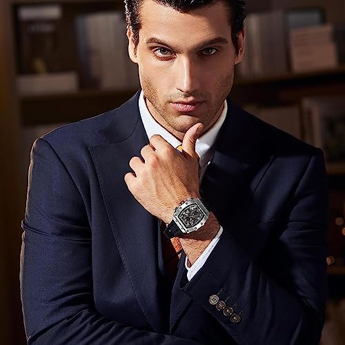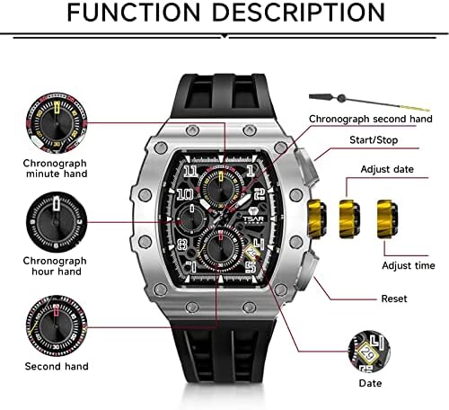 ⌚ Unique Design: The classic tonneau shape and the exterior shape of the exposed screws around the dial, together with the unique and complex design of the skeletonized dial, the crown design derived from the wheels and tire treads of a racing car, make this watch look luxurious and cool. The ergonomic double bridge design provides an extremely comfortable wearing experience, and the advanced innovative technology make this watch show the "Haute Couture" style. ⌚ Japanese Movement&Sapphire Crystal: This multifunctional chronograph watch with Imported Japanese movement, which ensures accuracy and stability. The case is made of 316L stainless steel with 202 steps processes, with high quality sapphire crystal, which has good wear resistance and visual impact. The silicone strap is soft and comfortable, and can last longer than you can imagine under normal use. ⌚ Waterproof&Luminous: TSAR BOMBA men's watch water resistance up to 50 meters/5 ATM, can easily withstand sweat, rain and splashing water, so you don't have to worry about daily water resistance. A-level super luminous function, let you read the time clearly even at night. (It can glow for 3-4 hours after absorbing enough light energy). ⌚ Ideal Gift: TSAR BOMBA watches are unique and sporty, with quality materials and excellent watchmaking craftsmanship, show your luxury temperament! Packaged in an exquisite box, this luxury watch is the ideal gift for yourself, your loved ones, friends and family for Birthday, Father's Day, Thanksgiving, etc. ⌚ CUSTOMER SATISFACTION: We provides an 90-day return policy and a 2-year after sales servive. We remain committed to providing a range of classic high quality designer men's watches and a high standard of customer service. If you have any questions about our watch for men, please contact us first and we will provide you with a satisfactory solution within 24 hours. #1,769,543 in Clothing, Shoes & Jewelry ( ) #10,011 in