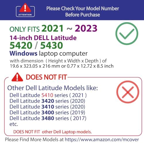 ☞⚠❤️?⭕️‼️ NOTE: Before placing order, PLEASE make sure to verify your laptop model number as this case is MODEL specific and NOT interchangeable. ‼️⭕️?❤️⚠☜ ❌‼️?⭕️ NOT fitting other Dell Latitude laptops. NOT compatible with ANY other Dell laptops as well. ❌‼️?⭕️ Made of high-quality translucent polycarbonate material which is shatter-proof and will protect your 2021-2023 14" Dell Latitude 5420 5430 Windows Laptops all around Designed to perfectly fit the 2021~2023 14" Dell Latitude 5420 5430 Windows Laptop with dimension of 12.65 x 8.35 x 0.82 inch ( 321.35 x 212 x 20.9 mm ) 2-piece light-weight(9.5 oz or 269 g) shell easily snaps on and off.