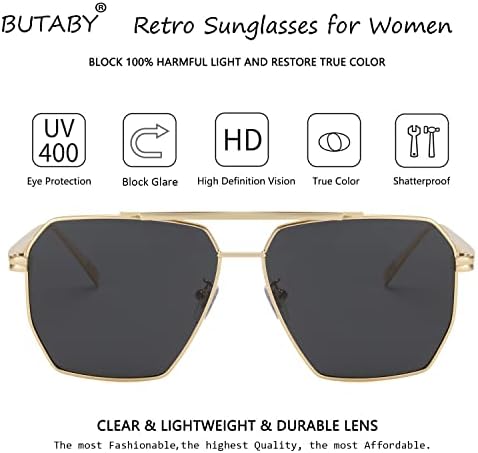 VINTAGE DESIGN - The fashion sunglasses features a flat top and double nose bridge design, not only is the oversized and square design makes slim frame looks very delicately, but also the aviator shape makes the overall look of the sunglasses more retro. With the super classic aviator shaped frame and square lenses, take a sense of high retro fashion on any occasion. HIGH QUALITY - The retro oversized aviator sunglasses are made of lightweight metal frame, thick but slim, not easily deformed, long wear does not press nose give you a unique and comfortable wearing experience. UV400 TAC POLARIZED LENSES - High definition UV400 polarized lenses effectively filters & blocks glares.Keep your eyes healthy and gives you a natural & clear vision, durable & shatterproof. SUITABLE - Perfect choice for outdoor activities such as walking, driving, shopping, travelling, taking photos, and is suitable as high fashion accessory and daily wear all year round. BUTABY's Motto - At BUTABY,our motto is that no need to pay a fortune to get a perfect pair of sunglasses.We are glad to have achieved balance between Quality, Fashion and Price. #80,615 in Clothing, Shoes & Jewelry ( ) #393 in #802 in