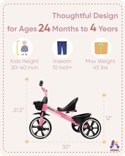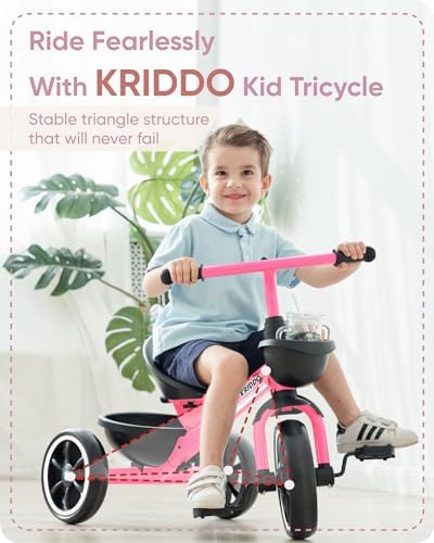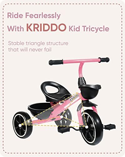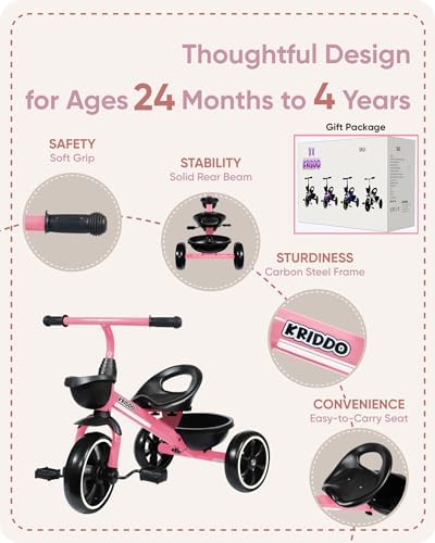 KRIDDO Tricycle for 2-5 Year Olds - Pink Toddler Trike With Gift for 24 Month to 4 Year Old Girls