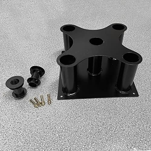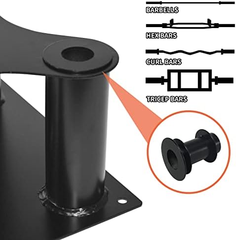 Holds up to 5 bars with diameter of 1" and 2" :Bar hole diameter: 2". Dimensions: 12"x12". Height: 6". The holder can hold 5 pc bars.Noted bolt it on the floor to prevent falling over. Vertical barbell holder floor stand :Our weight bar holder is constructed of heavy gauge steel for strength and stability, heavy duty bottom keeps the bars straight and upright. Black powder coating finish features scratch proof and rust resistant, all for a long time use. Barbell Storage Holder: Are you still worried that the barbell rack can't be found or takes up space? Our Barbell storage Holder is a great idea for anyone who's looking for a bar holder that layout takes up little space. Its compact design helps organize the messy barbells bars, make you enjoy a tidy exercise environment. SturdyPowder Coated:This barbell holder with premium coating, Scratch resistant friction resistant, protects its structure from scratches. Package including: 1 piece of heavy duty barbell storage rack. (mounting hardware included-screews)
