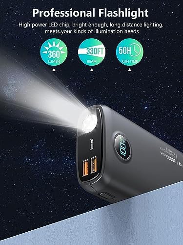 Safe and Fast Charging Pro Power banks: Power Bank is manufactured using the highest grade materials, Such as the fireproof shell, pass 10 safety protection design PCB motherboards, well-known brand A + grade polymer safety battery core, Pass strict 8 times safety test, please buy with confidence 22.5W Fast Charging Technology: The latest Supercharge Protocol, 22.5W PD3.0 PD4.0 Portable Phone Charger can revolutionize your charging speed experience, it can charge for iPhone13 from 0% up to 50% in 30 minutes, 3 times faster than the old 10W power bank Power for 3 devices at once: portable power bank with a built-in Type-C port (Input and Output) and two USB ports, it can charge three devices at the same time. Like cellphone, Apple Watch, Earphone and more Provides a week's worth of power: 30,000mAh Large Capacity Portable Charger Power Bank, battery pack can meet your charging needs for a week, it can charge for iPhone 12 up to 5 times, iPhone 13 up to 4.5 times, Galaxy S22 Ultra up to 3.5 times, iPad mini up to 2.7 times Equipped with professional version flashlight: Unlike most portable charger on the market that come with lights whose lumens are not sufficient for dark lighting, we are equipped with a 3W power white laser high-brightness wick, 360 lumens, which can illuminate more than 100 meters;Like camping and picnicking, cycling adventure, security patrol, night travel and other scenarios, which provides you with 50 hours of working time