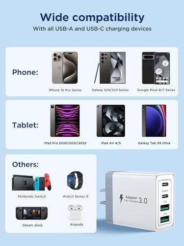 【High-Speed Charging】: The USB-C port supports a maximum power output of 20W. Aioneus usb c charging block offers fast and efficient charging up to 3X faster than a 5W charger block. Charge your iPhone devices from 0% to 50% in just 30 minutes. 【USB Wall Charger Multiport】: New Upgraded Design - ONE CHARGER BLOCK with Dual USB-C ports and Dual USB-A ports. Allow users to charge phone, tablet, laptop and headphones simultaneously to minimize waiting time. It’s also a great space saver instead of taking up 4 wall outlet ports. The best replacement for your original usb charger. 【For All Your Devices】: This type c charging block compatible with All smartphones and tablets, such as iPhone 14/14 Pro/14 Pro Max/14 Plus/13/13 Pro/13 Pro Max/13 Mini/12/12 Pro/12 Pro Max/12 Mini/11/11 Pro/11 Pro Max, iPhone XS/XS Max/XR/X/10/8/8 Plus/7/7 Plus/6/6S/SE 2020, iPad, iPad Pro, iPad Air, iPad Mini, Samsung Galaxy S22/S21/S20/S10/S9/S8/S7/S6/A12/A13/A22/A32/A52/A53/A71/Note 20 10, LG, Motorola, Google Pixel, Kindle Fire, Tablets, etc. 【Complete Safety & Reliability】: Certified RoHS, CE & FCC, protect devices from overheated and over-currents, overcharging, and short circuits, charging will be automatically stopped when the battery is full. The usb c charger block featured with ABS + PC fireproof material, you can make sure your digital devices are always safe charge. 【Portable, Compact Design】: Incredibly compact size for enhanced portability. All this power comes installed in a pocket-friendly compact body, to go wherever the journey takes you. Ideal for home, office and on the go. We provide this 40W 4-Port USB C Wall Charger (cable not included) with 18 Months Worry-free Replacement and 24/7 Online Customer Service. If you have any problem, please contact us freely.