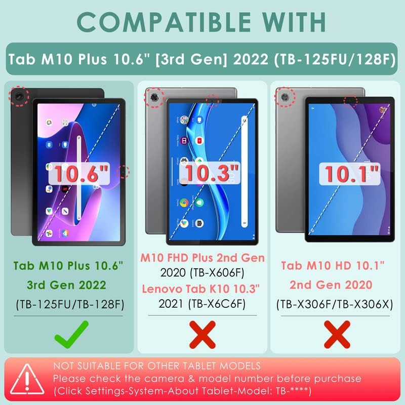 ?【COMPATIBILITY】- Heavy duty cover compatible with Lenovo Tab M10 Plus 3rd Gen 10.6 inch 2022 (Model: TB-125F/ TB-128F). ? [ATTENTION]: NOT FIT Tab M10 FHD Plus 10.3" 2nd Gen 2020 (TB-X606F/X) or other model tablets. ❤ [Warm Tips]: Please check the tablet model and camera position refer to the model compatibility image [2] before purchase (Click "Settings-System-About Tablet-Model") ?【3-LAYERS FULL BODY PROTECTION】- Funda para Lenovo Tab M10 Plus 3rd Gen case for kids combined of hard PC top frame bumper (NOT INCLUDE SCREEN PROTECTOR) + polycarbonate inner shell + soft silicone outer cover with corner protection design. This hybrid heavy duty shockproof Lenovo M10 Plus TB-125FU case provides total full body protection against scratches, shocks, fingerprints and dust ?【360 DEGREE ROTATING KICKSTAND】- Funda para Lenovo Tab M10 Plus 10.6" kids case for TB125FU could be swivelable adjusted to multiple angles and make your tablet works like a laptop, so it's perfect for typing or watching videos. Free your hands for other entertainments to avoid any joint pain. The kickstand also work as a portable handle ring or hanging on hook ?【SHOULDER STRAP】- Kids case for Lenovo Tab M10 Plus 3rd Generation come with a shoulder strap (length adjustable), it can be suspended in the car seat back for children watching safety. Lenovo M10 Plus 3rd Gen 10.6" protective cover shell with shoulder strap, it's convenient for adult or children to carry out for outdoor activities ?【MILITARY GRADE PROTECTION & AFTER-SALES SERVICE】- Lenovo Tab M10 Plus 2022 Case 10.6 inch heavy duty tablet cover enhanced drop protection with extra shock absorption to protect your precious device. ❤ If the product you've received is defective (not included man-made damage), don't hesitate to seek advice from us for replacement or refund