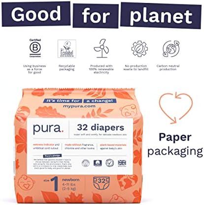 GOOD FOR BABIES: Totally Chlorine Free (TCF) Super soft and comfy, our diapers are enhanced with organic cotton, perfect for delicate newborn skin. With only plant-based materials against your baby’s bottom, our dermatologically tested, allergy-certified diapers are made without fragrance, chlorine bleaching, lotion, parabens, natural rubber latex and phthalates. PERFECT FOR NEWBORNS: Our diapers feature a special umbilical cord cut-out, contoured to protect the delicate belly area. They also feature a handy color-changing wetness indicator, so you know when it’s time for a diaper change! GOOD FOR THE PLANET: Pura’s EU EcoLabel accredited diapers are manufactured in a carbon neutral plant, powered by green electricity. Where possible, we’ve replaced non-sustainable materials with lower impact materials such as wood pulp from sustainably managed forests in the absorbent core of our diapers. Our packaging is made from paper, so it's easier to recycle! TRUSTED BY PARENTS: Made in the EU to the highest standards, Pura diapers have won multiple awards, voted for by real parents. USING BUSINESS FOR GOOD: Pura is a certified B-Corp and a Carbon Neutral business. #216 in Baby ( ) #16 in #236 in