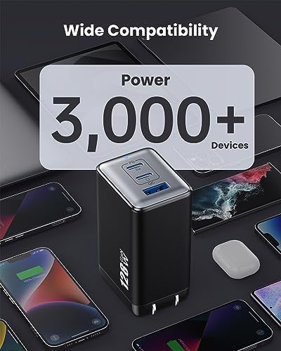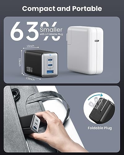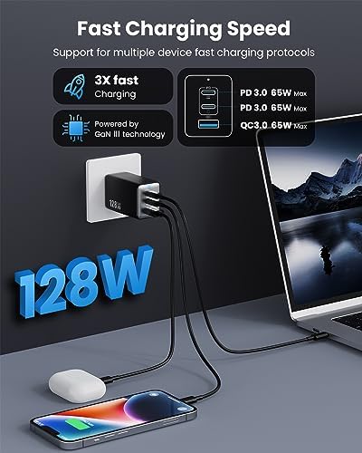 128W USB C Wall Charger,GaN III 3-Port Fast Charging Station,PD QC Foldable Charger Block Portable 65W Laptop Adapter for MacBook Pro/Air,iPad Pro,Galaxy S23,Dell XPS 13,iPhone 15/Pro etc Black