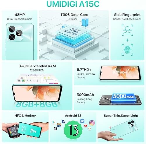 【16GB(8GB+8GB RAM) & Unisoc T606 Android phones】Umidigi A15C unlocked android cell phone powerful by Unisoc T606 Octa-Core Processor, Up to 16GB RAM (8GB +8GB Extended RAM) )and 128GB ROM Supports expandable storage up to 1TB. provides fast data transfer speeds and allows for quick app launches and smooth multitasking. 【Android 13 &5000mAh Lasting-Long Battery Unlocked phone】Say goodbye to battery anxiety with the Umidigi A15C smartphone's massive 5000mAh battery . the Umidigi A15C cell phone also supports 10W charging via USB Type-C, allowing you to quickly and easily recharge your phone. 【6.7"HD Large Full View Display mobile phone 】Umidigi A15C cell phones With a 6.7-inch Full HD+ display offers a truly immersive viewing experience. 1650*720 resolution allows for sharp and detailed images, 20.06:9 aspect ratio offers a wider display area for a more cinematic viewing experience. It is especially useful for mobile gamers who require precise and accurate touch input for games. 【48MP Ultra-Clear AI Camera phone】Umidigi A15C android smartphone equipped features dual 48MP AI rear camera that captures ultra-clear and detailed photos and videos. The phone also includes an 8MP front-facing camera that takes high-quality selfies and supports video calls. 【 Multifunctional NFC & Hotkey android cell phone】UMIDIGI A15C Powered by powerful sensors, NFC allows you to pay anywhere, anytime without any hassle. You can even use it as a virtual key for your home and office.Hotkey allows users to customize its features to their liking. For example, launching applications, taking screenshots or controlling device settings. 【Headset-free FM Radio & Dual Unlock android smartphone】With the UMIDIGI A15C, you can enjoy international FM radio or world radio without headphones. Side Fingerprint Sensor and Face Unlock , you can unlock your device, authorize transactions and more, provides users with a fast, convenient, secure, and personalized method of device authentication without the need for a password or pin. 【Globalbands & Dual SIM unlocked cell phones】Umidigi A15C smart phone support more than 30 bands,Support dual Nano-SIM card or Nano-SIM + dedicated Micro-SD expansion memory card.