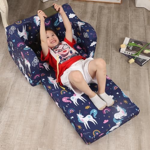 Rainbow Unicorn Printed: Add a touch of charm and enchantment to kids' freedom space with our so-soft kids sofa featuring magical unicorns. Kids Friendly Design: The comfy kids chair is lightweight for kids to move to any room they want, whether its reading, playing video games, watching tv, or just relaxing, children can play with this sofa as they please. Kids Convertible Sofa: The Kids Chairs is perfect for kids sitting and reading or watching their favortie cartoon. During nap time this sofa chair folds out into a comfy nap pad. Toddler Couch Safety and Reliability: The kids sofa chair is made of durable soft polyester that is easy to clean and is filled with premium foam to support kid's body. The sofa is designed with safety in mind, as there are no sharp corners or hard edges.