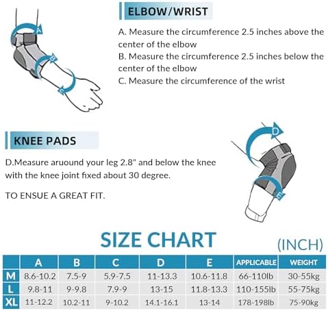 STURDY & PROTACTIVE MATERIAL Made of sturdy, soft EVA padding and tough plastic sheeting, with longer and larger pads and multiple layers of protection to ensure safety during sports and games. EASY TO CARRY The 6-in-1 protective set includes knee pads, elbow pads, and wrist guards. The protective gear set can be carried in a mesh bag when playing sports indoors or outdoors. It can be taken anywhere due to the lightweight and convenience. TWO WAYS TO WEAR Adjustable Velcro and elastic bands provide two ways of wearing. Direct binding for strong people or for summer when wearing short sleeves and shorts.Sleeves + straps. Suitable for thin people or wear long sleeves and pants. FIT FOR MULTIPLE SPORTING The protective gear set can be used with roller skating, skateboarding, cycling, scooter and various action outdoor sports to provide you with protection. To prevent the protective gear from falling off and shifting during exercise, please make sure that each part is worn correctly. COMFORTABLE AND BREATHABLE Double-sided twill elastic is adjustable for secure comfort at the knees, elbows and wrists. And breathable fabric keeps them dry and fresh and reduces sweating during hours of skating.