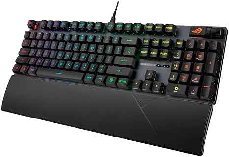 ROG RX optical switches: Pre-lubed RX switches feature centralized lighting and provide consistent wobble-free keystrokes with near-zero debounce delay IP57-rated: Waterproof and dust resistant for long-lasting durability Hotkeys: F1–F5 keys are pre-programmed as hotkeys for Xbox Game Bar and recording Intuitive controls: Multifunction button and three-way knob for media playback, volume, and keyboard lighting Sound-dampening foam: Integrated foam absorbs pinging noises and echoes for improved acoustics