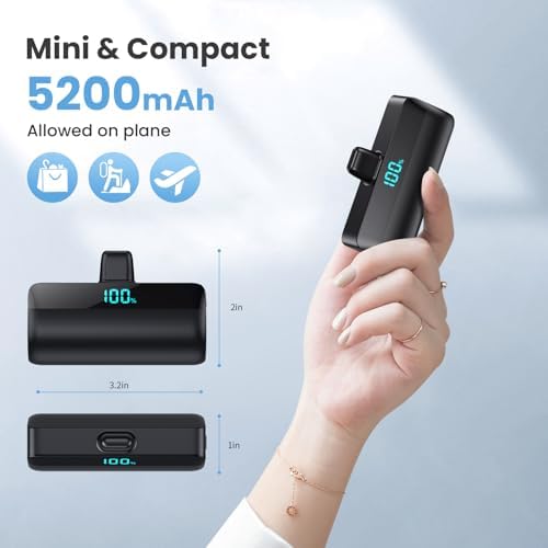 Plug-and-Charging: Say goodbye to tangled cables! The portable charger with the USB C plug, you can directly connect it to your phone for charging without the need for an extra data cable. Designed Specifically for USB C Devices: The portable charger precisely tailored to fit iPhone 15 series(iPhone 15/15pro/15plus/15pro max) and all Android cellphones, such as Samsung Galaxy,Pixel,LG,Oneplus,Moto,Google and other USB-C devices. Meeting the charging needs of various devices. Portable and Convenient -5200mAh Capacity: The portable phone charger's mini and lightweight design makes it extremely portable and convenient for travel, without any burden. And the powerful 5200mAh capacity keeping you connected all day long. Smart LCD Display Screen: The LCD digital display allows you to see the power status of the power bank clearly. The unique screen-off design can automatically turn off the screen while after 30S/60S after charging/discharge mode, and the real-time power level can be displayed at the press of a button. PD Fast Charging and Pass-Through Technology: With PD fast charging technology, the portable charger can quickly charge the battery and allow your devices to regain power rapidly. Moreover, it supports the pass-through technology that enables you to use your phone while charging. Safe and Reliable Charging Protection - Equipped with a built-in safety chip and multiple protection features, this power bank ensures a secure charging experience for your precious devices, protecting them from overcharging, overheating, short circuit, and more. What You Get: 1 * 5200mAh portable charger , 1 * usb c cable, and a velvet bag, along with a 2-year warranty policy and lifetime technical support, we provide you with comprehensive service and assurance, ensuring a worry-free purchase.