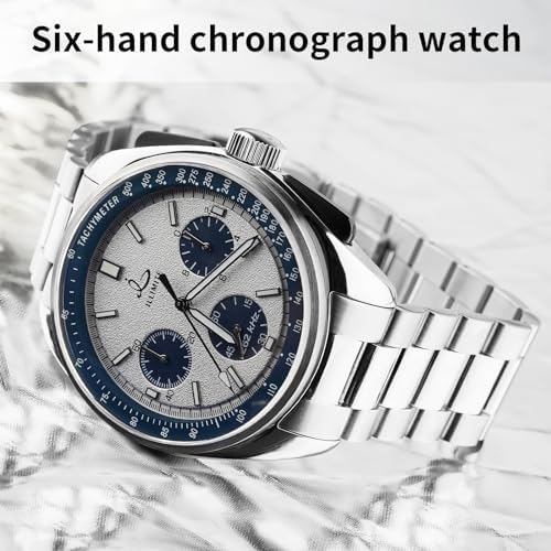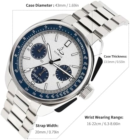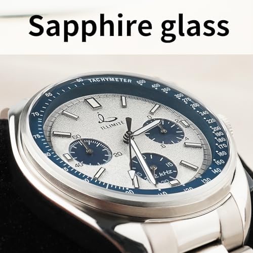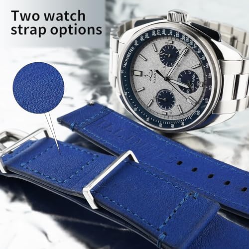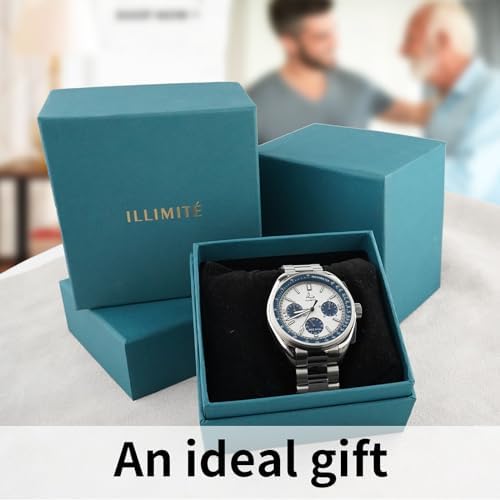 【Fashionable Lunar Pilot Style Design】This 6-hand chronograph watch features a black dial with white markers, showcasing a classic black-and-white combination that exudes a fashionable aviator aesthetic. The three sunburst-effect black sub-dials at 3, 6, and 9 o'clock positions complement its allure. 【Precise Timing Capabilities】Equipped Japan imported watch Miyota 6S20 movements with a secondary seconds hand within the 6 o'clock sub-dial and a large central seconds hand functioning as a chronograph, the watch offers precise timekeeping. The 3 o'clock sub-dial provides 1/10th timing functionality, while the 9 o'clock sub-dial offers a 60-minute timer. 【Premium Stainless Steel Build】Crafted from high-quality stainless steel, both the case and bracelet ensure durability,secured by a Double Push Button Folding Clasp for effortless wearability. Additionally, it includes a black genuine leather strap for versatile dress styling. 【Functional Features and Durability】The scratch-resistant sapphire crystal, luminous hands and clock scale markers for low-light visibility, and the black outer ring white scale on the dial serving as a speedometer all contribute to its functionality. With a 5ATM (50m) water resistance rating, it's suitable for daily activities, ensuring resilience for everyday use. 【Worry-free after-sales service】If you encounter any problems when purchasing our ILLIMITE men's watches, please feel-free to contact us. We are committed to providing you with satisfactory solutions. #743,275 in Clothing, Shoes & Jewelry ( ) #4,421 in