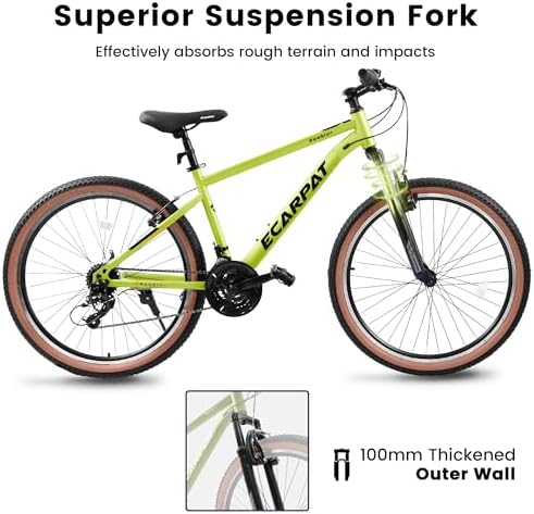 Rycheer Ecarpat 24 26 27.5 Inch Mountain Bike, 21 Speeds with V/Disc Brakes Aluminum/High-Carbon Steel Frame Mens Womens Mountain Bike, Front Suspension MTB Bicycle for Adult & Teenagers