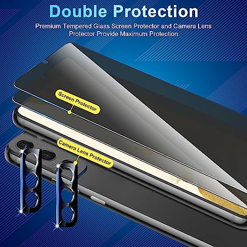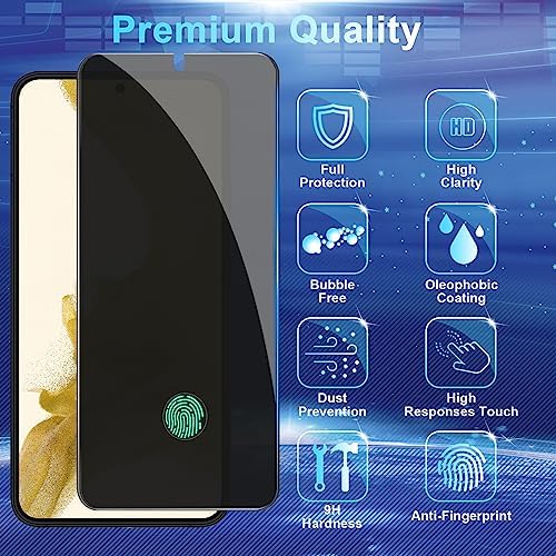 ?【Privacy Tempered Film】: The privacy tempered film blocks out 99% of visible light, preventing onlookers from seeing your screen from various angles. ?【Camera Lens Tempered Glass】: The 2 pack of camera lens tempered glass is specially designed to protect your device's rear camera lens from dust, dirt, and scratches. ?【High Clarity】: This Privacy Screen Protector has high clarity and is bubble free, so you can still enjoy a crystal clear view. ?【Anti-Spy Protection】: The anti-spy protection also works to prevent identity theft and helps protect your online banking and other sensitive information. ?【Compatibility】: This Privacy Screen Protector is compatible with Samsung Galaxy S22 5G.If you have questions about installation, please contact us promptly.